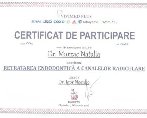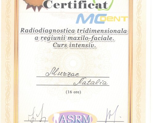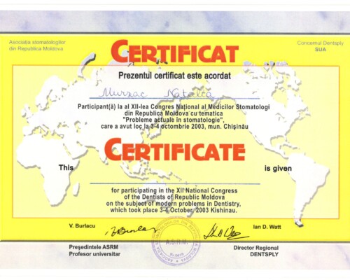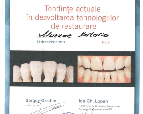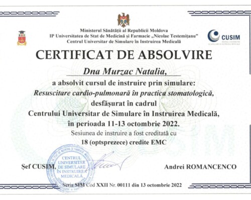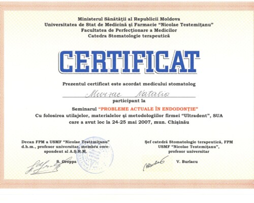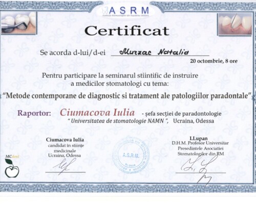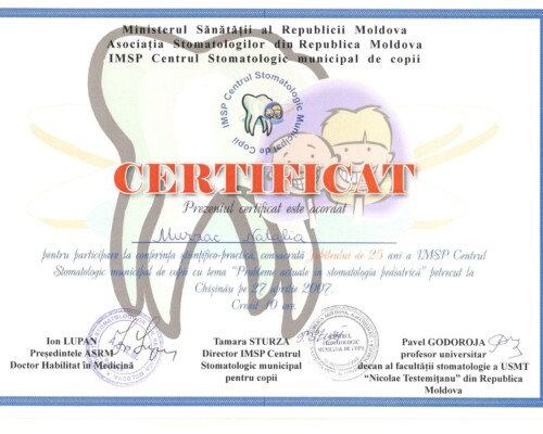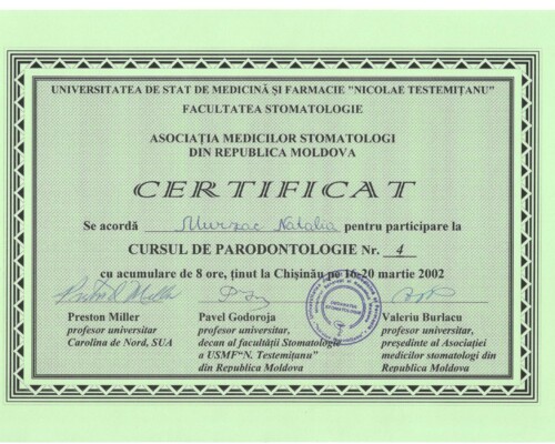 - Последипломное обучение по резидентуре по специальности «Врач-стоматолог» в Университете медицины и фармации «Николай Тестемицану», 2000–2003