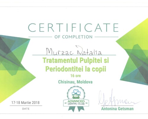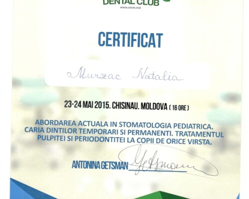 - 2015 – Современный подход в детской стоматологии. Кариес временных и постоянных зубов. Лечение пульпита и периодонтита у детей любого возраста (16 часов)