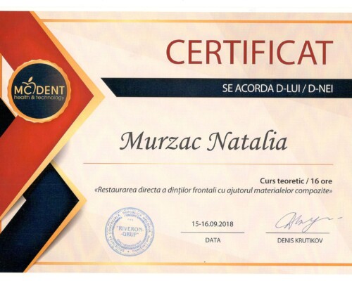 - 2015 – Реставрация фронтальных и боковых зубов (9 часов)