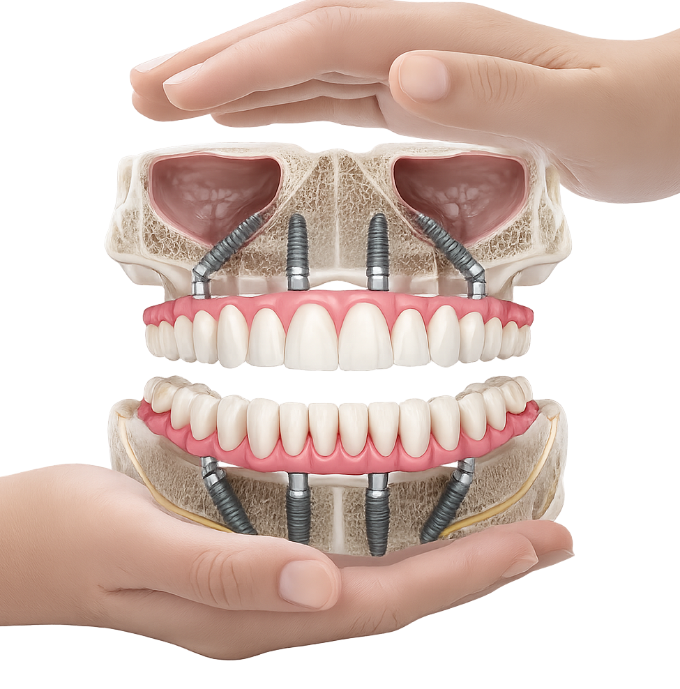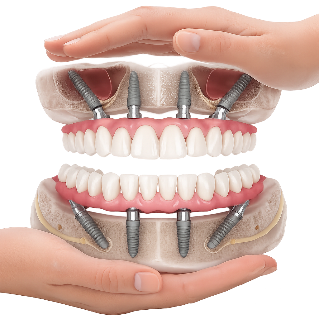 Pentru pacienții cu edentație extinsă sau dinți nefuncționali, conceptele All-on-4 și All-on-6 oferă soluții fixe, moderne și eficiente, care asigură estetică, confort și funcționalitate superioară față de proteza mobilă.