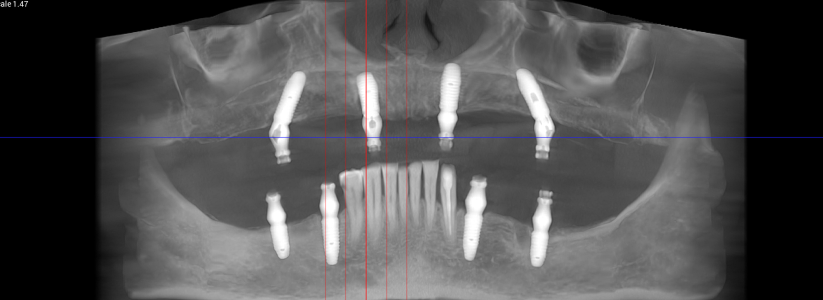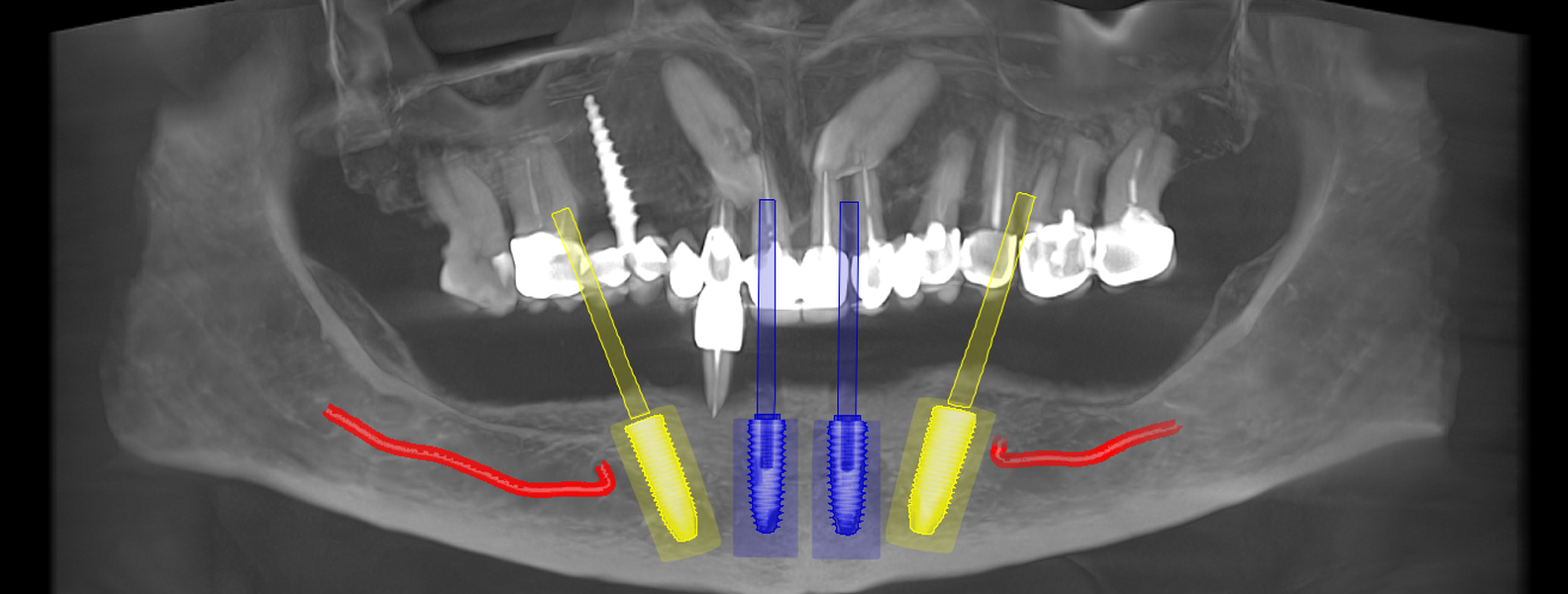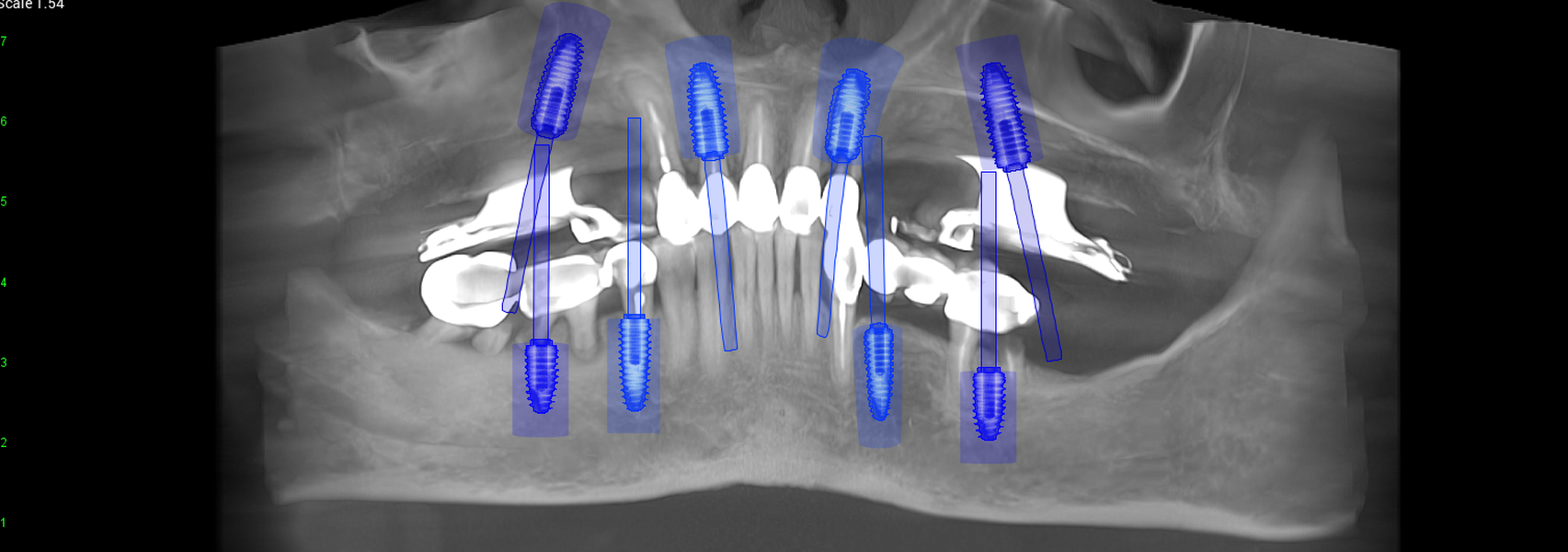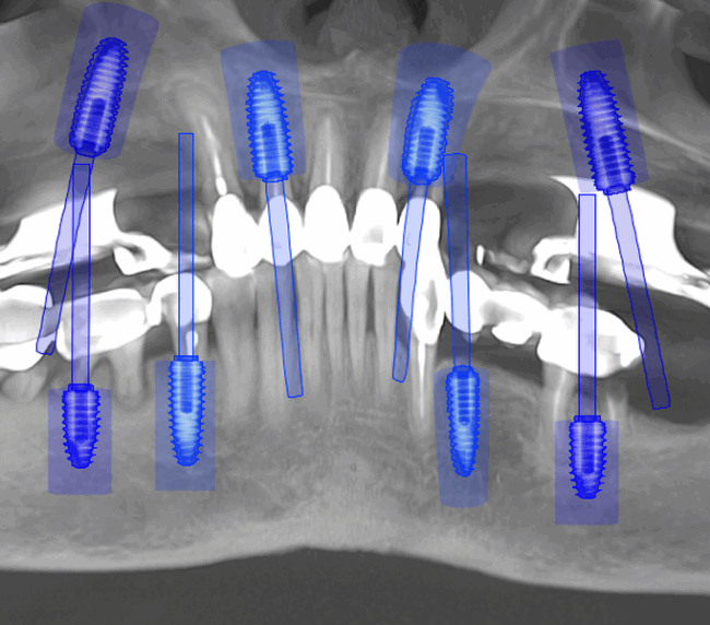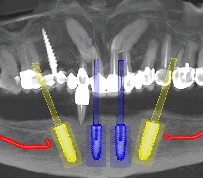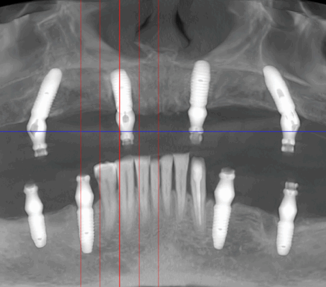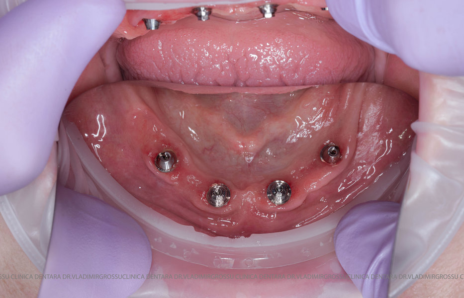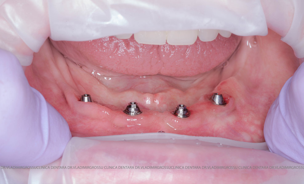 studii științifice.În cazurile de atrofie osoasă severă, când inserarea implanturilor în zonele laterale nu este posibilă fără adăugare osoasă, conceptul All-on-4 prevede plasarea implanturilor în unghiuri strategice pentru a evita zonele deficitare. Astfel, două implanturi sunt plasate în zona incisivilor laterali, iar alte două în zona premolarilor.
