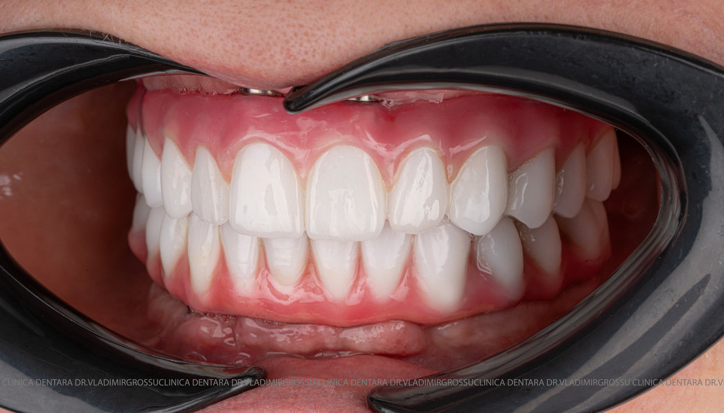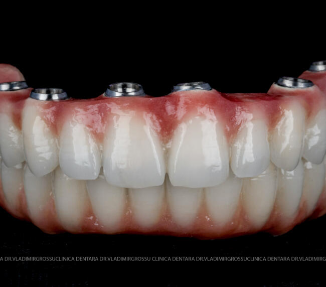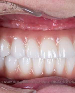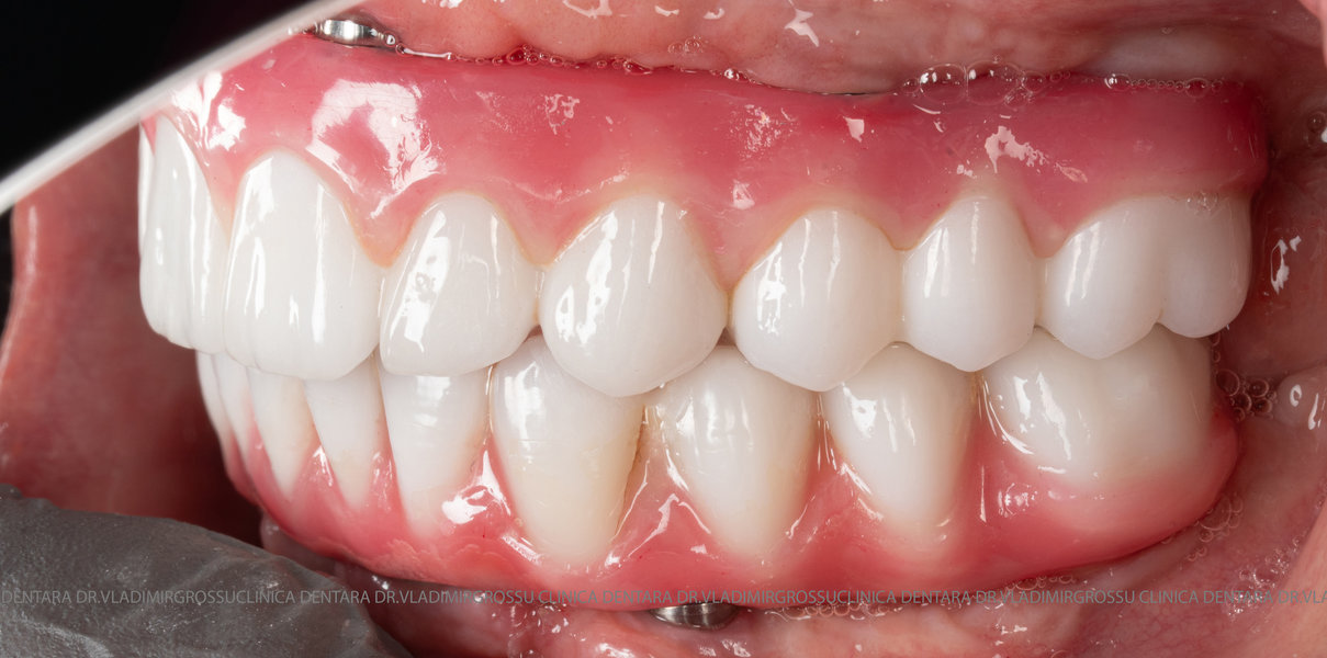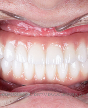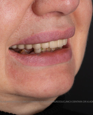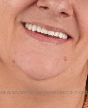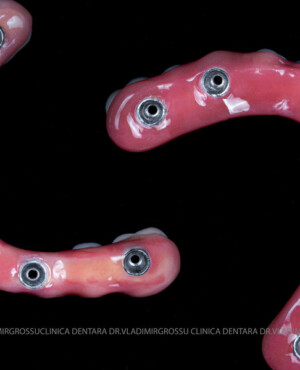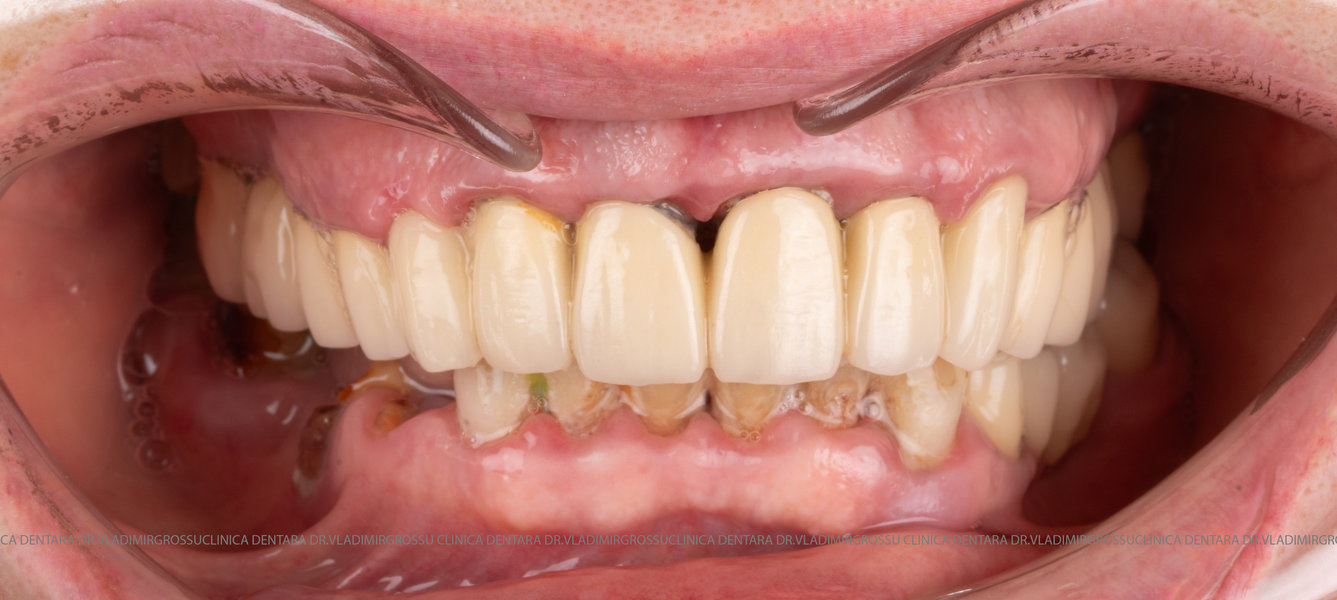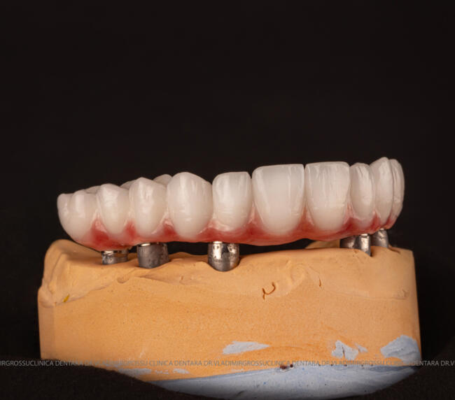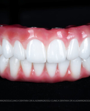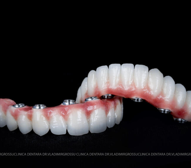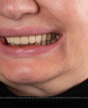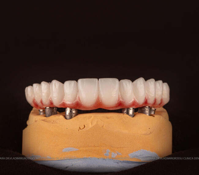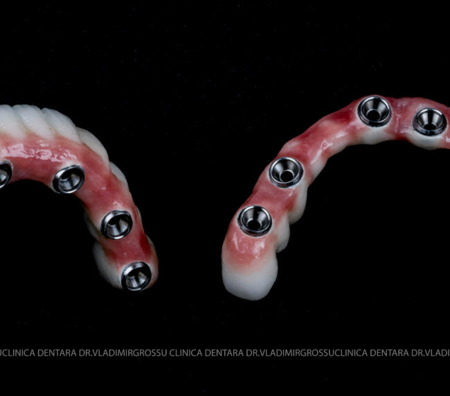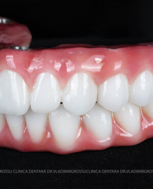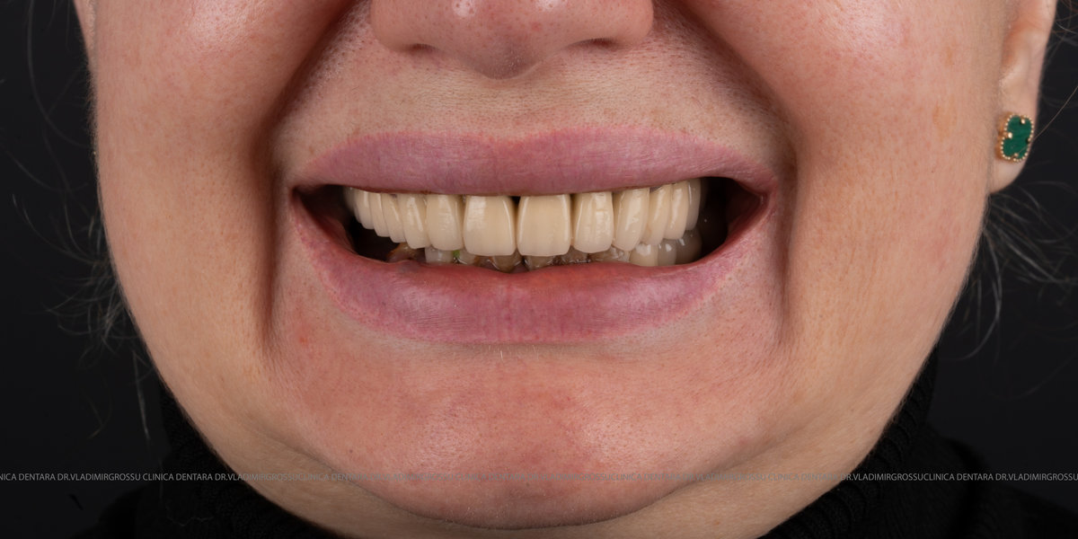 - Proteză definitivă realizată din metaloceramică sau zirconiu, cu 12-14 unități (soluția recomandată).
