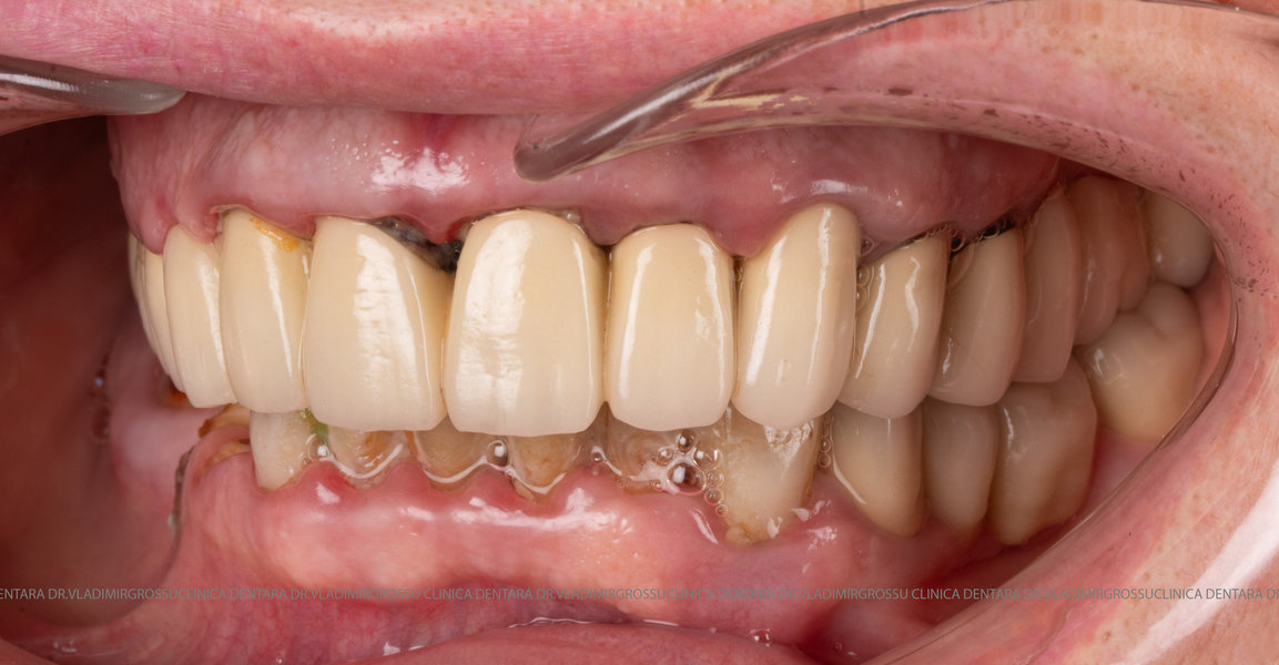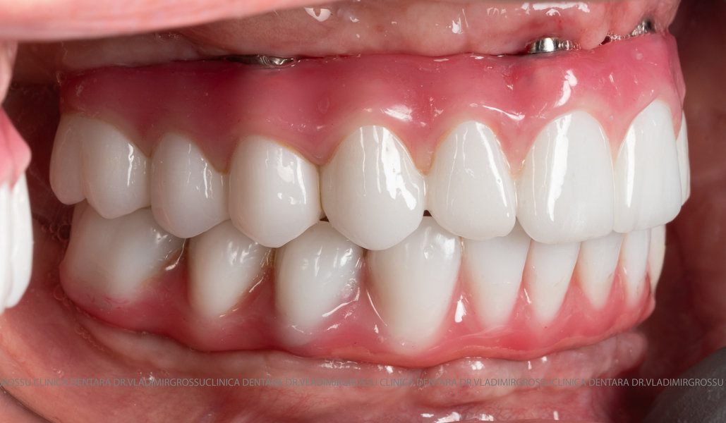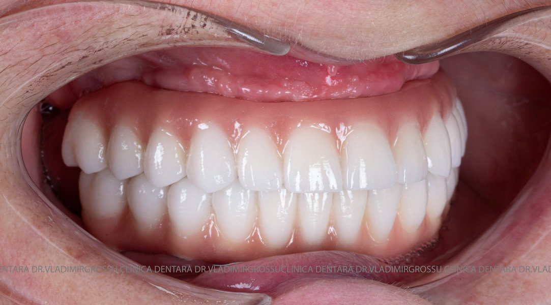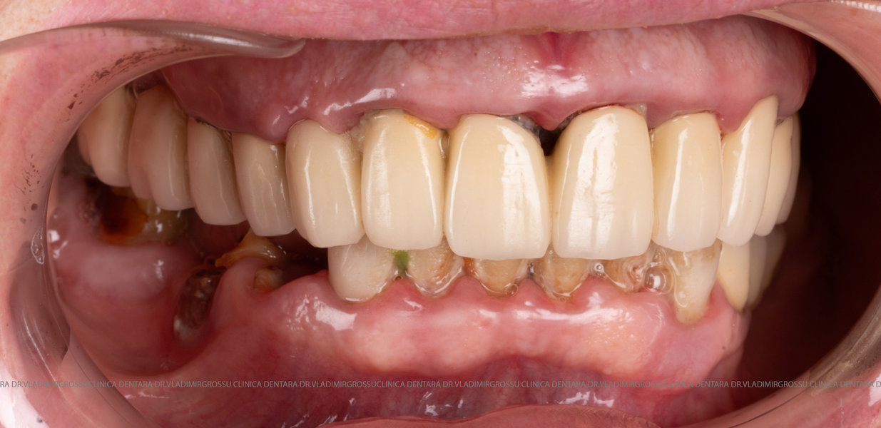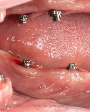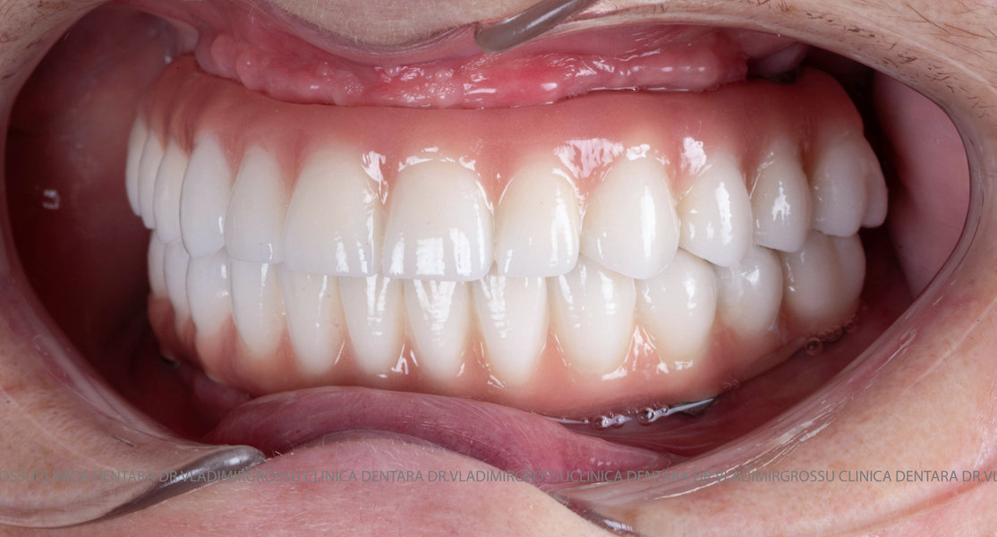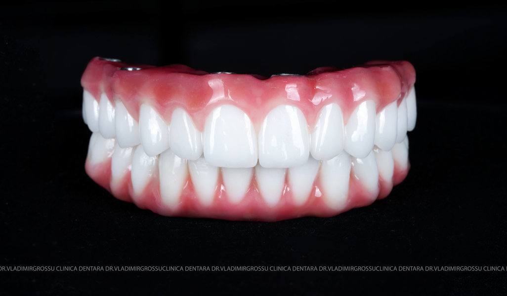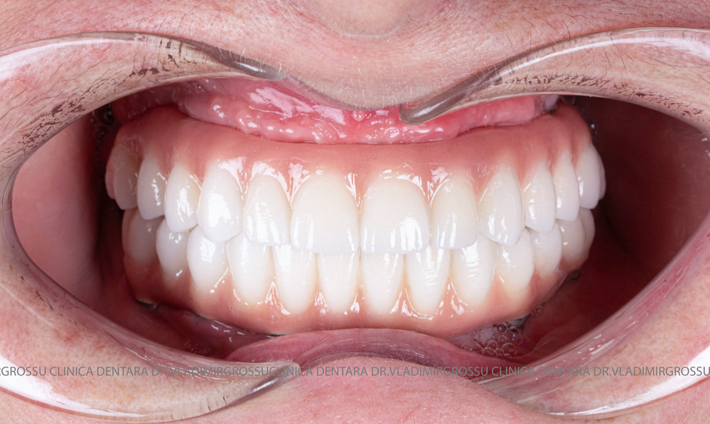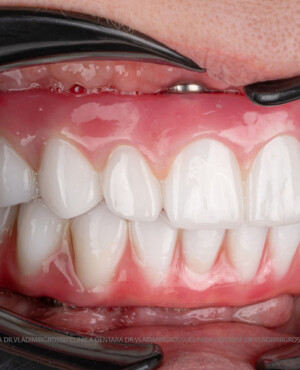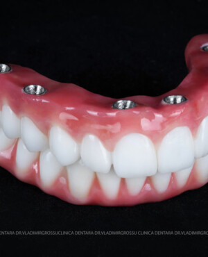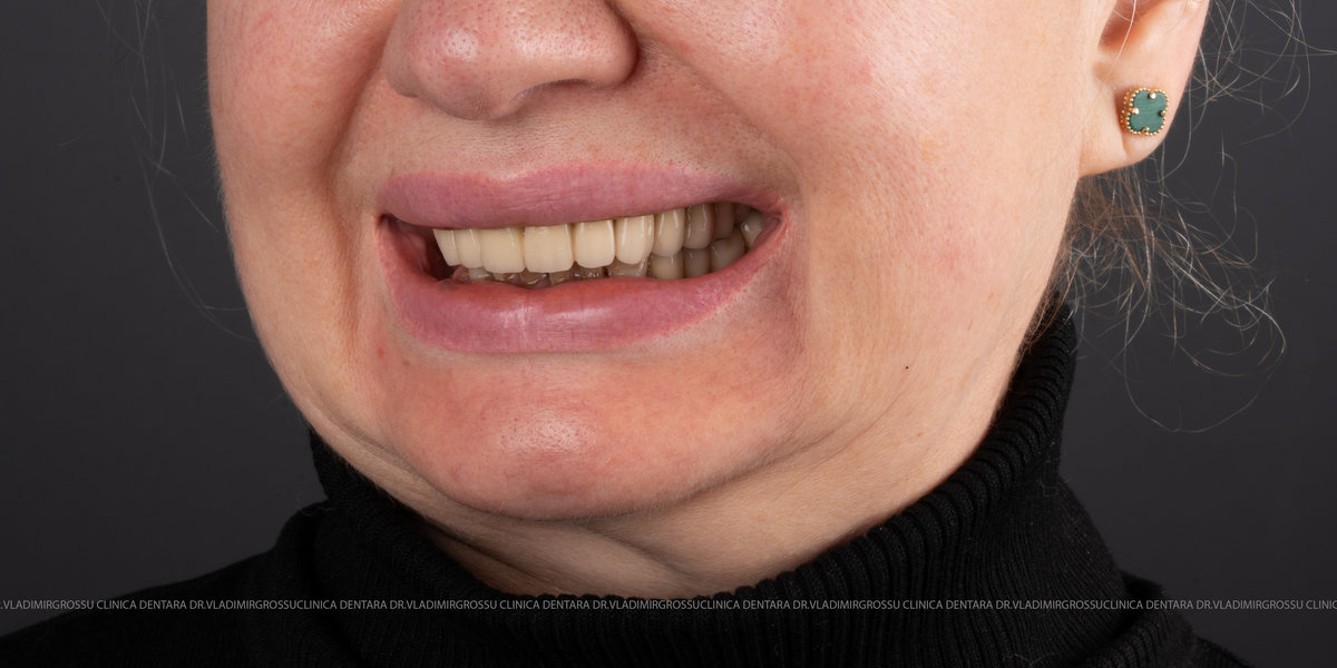 - Proteză definitivă realizată din metaloceramică sau zirconiu, cu 12-14 unități (soluția recomandată).