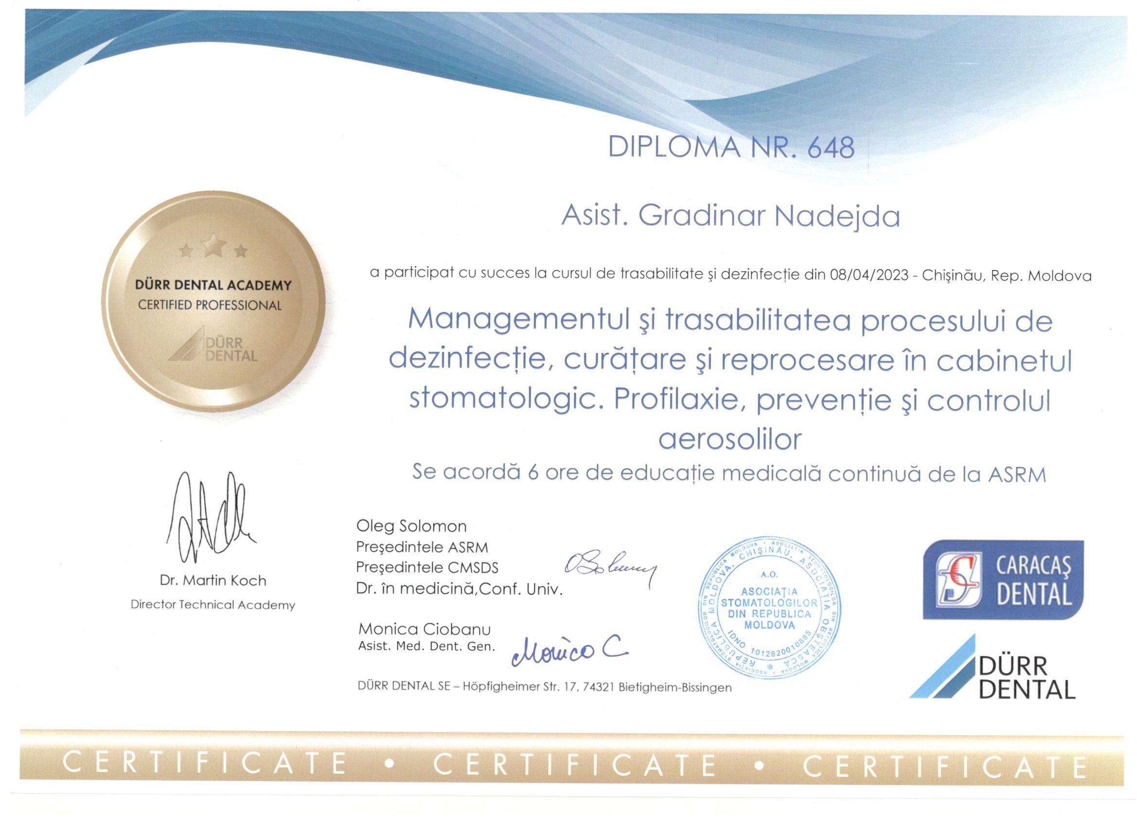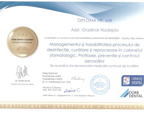 - 2023 – Managementul și trasabilitatea procesului de dezinfecție, curățare și reprocesare în cabinetul stomatologic. Profilaxie, prevenție și controlul aerosolilor.
