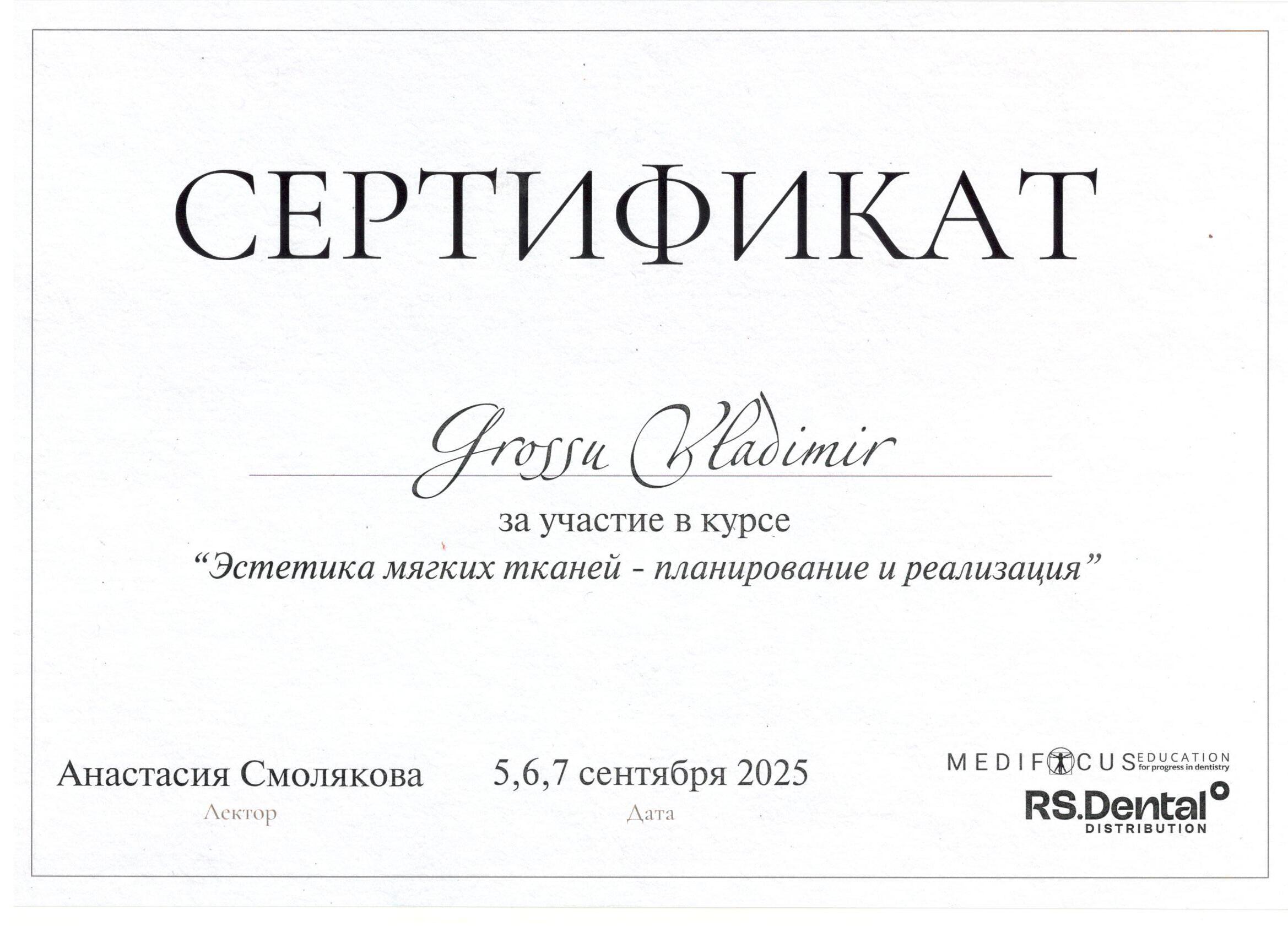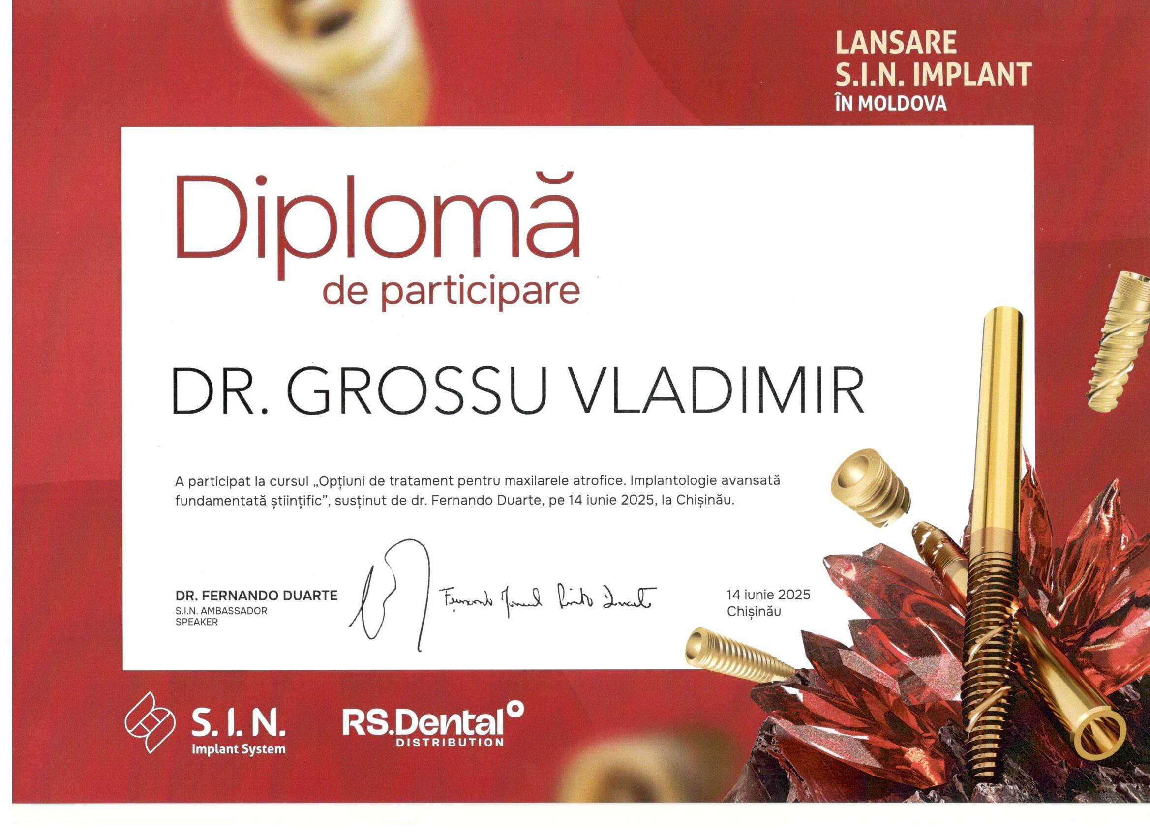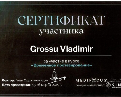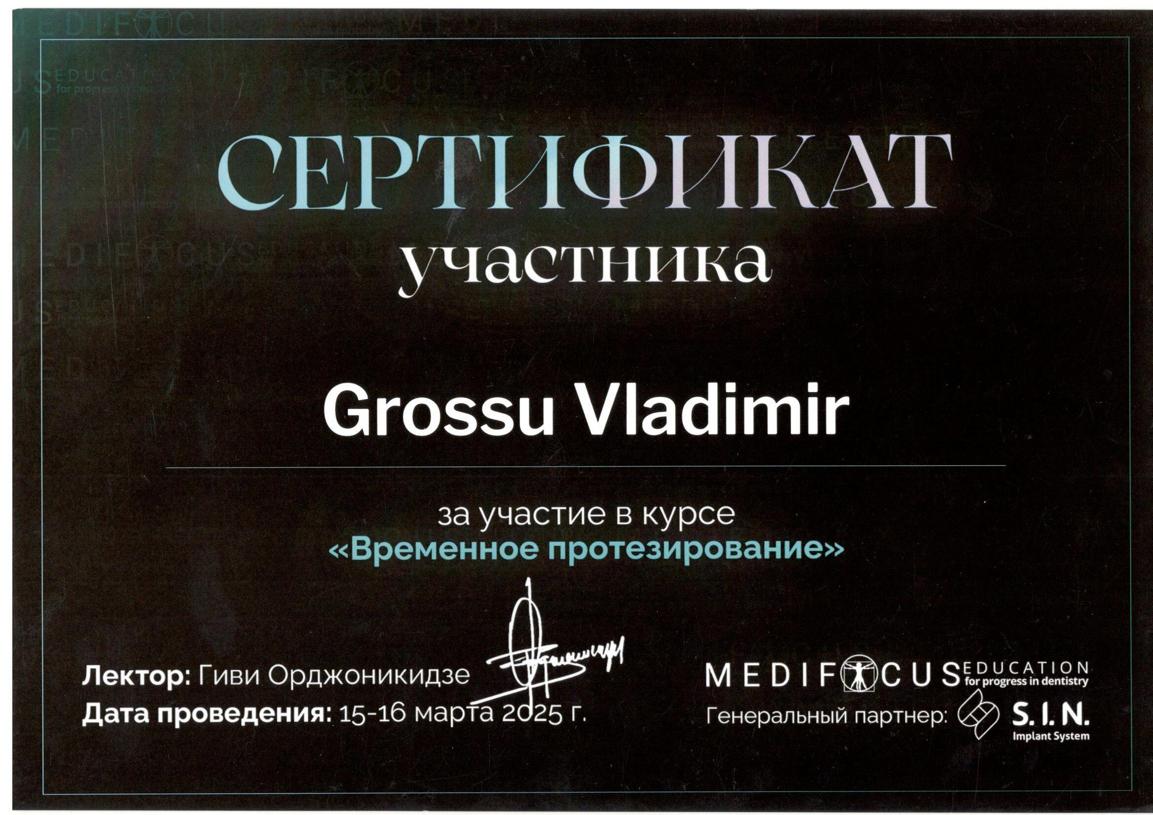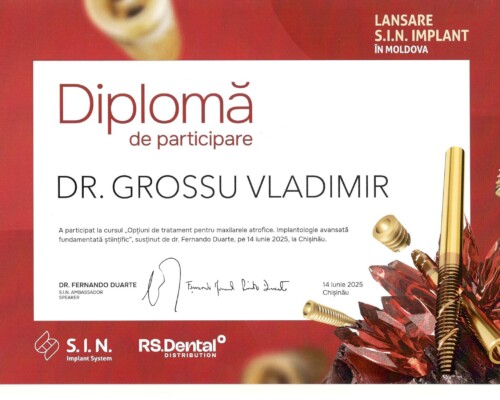 Dr. Grossu Vladimir, medic stomatolog chirurg, protezist și implantolog, precum și director al clinicii, oferă tratamente stomatologice complexe, de la intervenții chirurgicale și implantologie, până la reabilitări protetice totale și restaurări funcționale avansate. Fiecare caz este abordat printr-o analiză clinică riguroasă și un plan de tratament personalizat, orientat spre stabilitate, estetică și durabilitate pe termen lung.