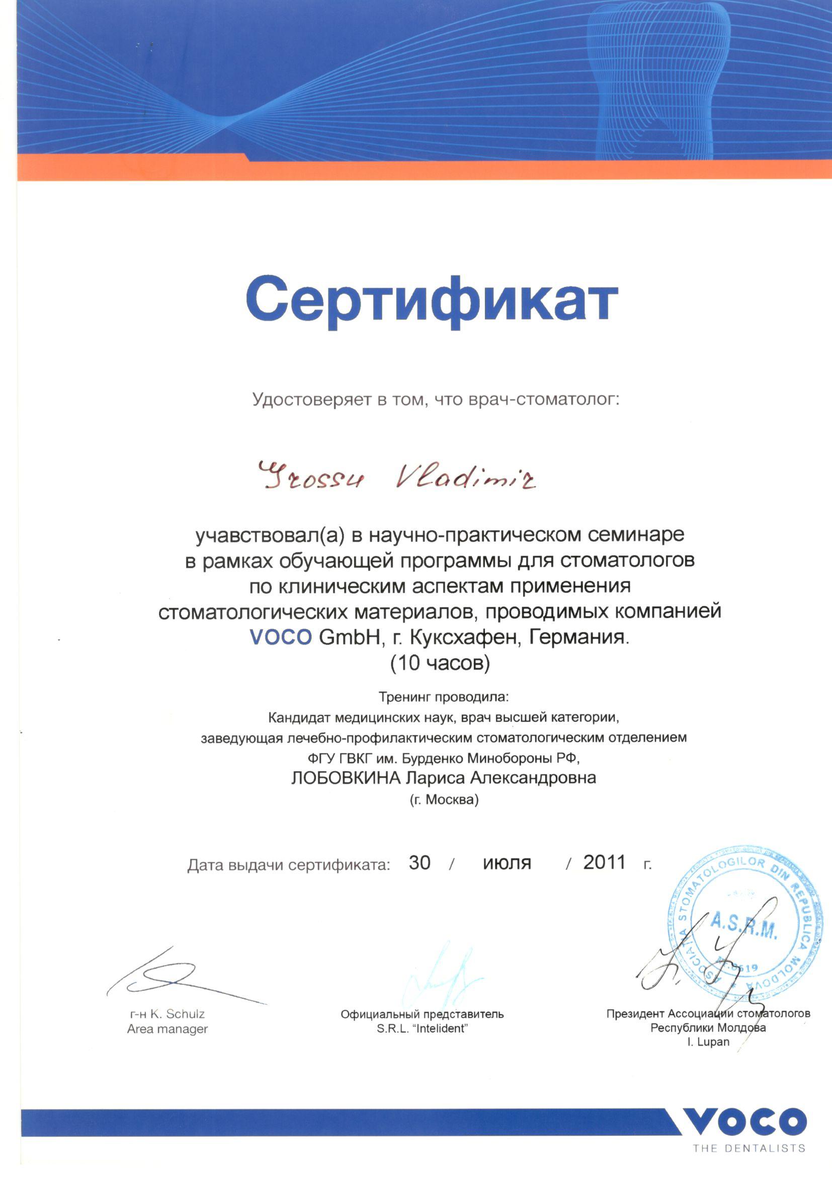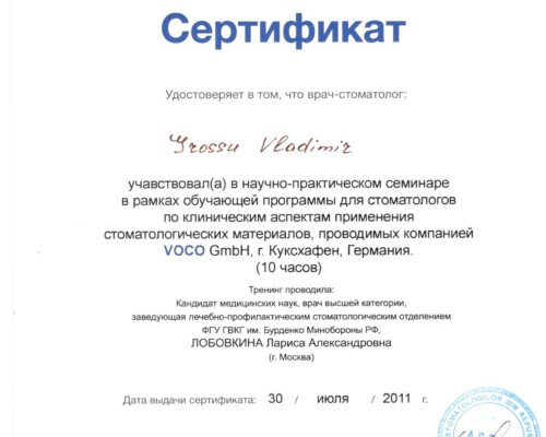 - 2011 – «Научно-практический семинар в рамках обучающей программы для стоматологов по клиническим аспектам применения стоматологических материалов»2011 – «Общение с пациентом как средство повышения качества предоставляемых услуг »