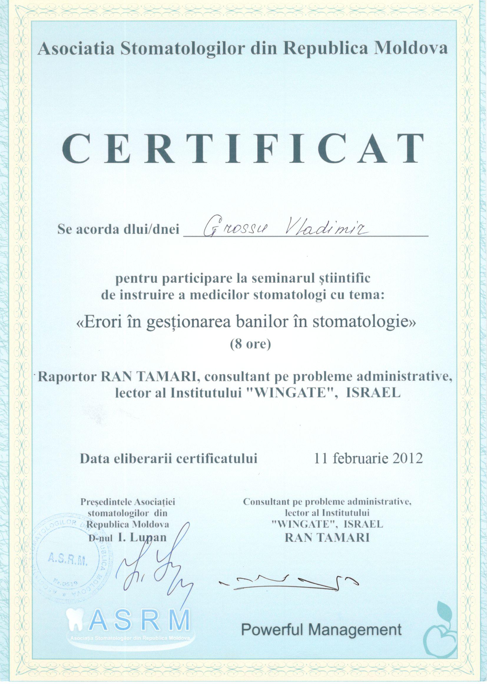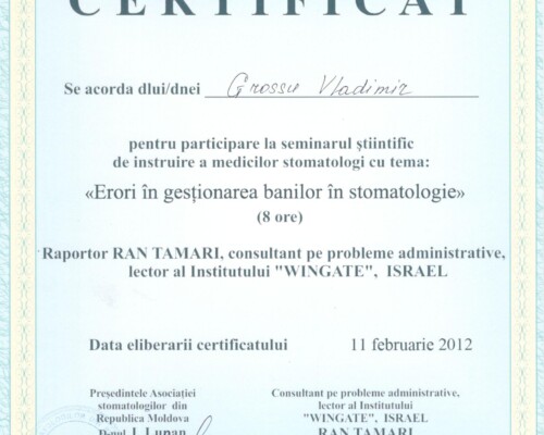 - 2012 – «Erori în gestionarea resurselor în stomatologie» (8 ore)
