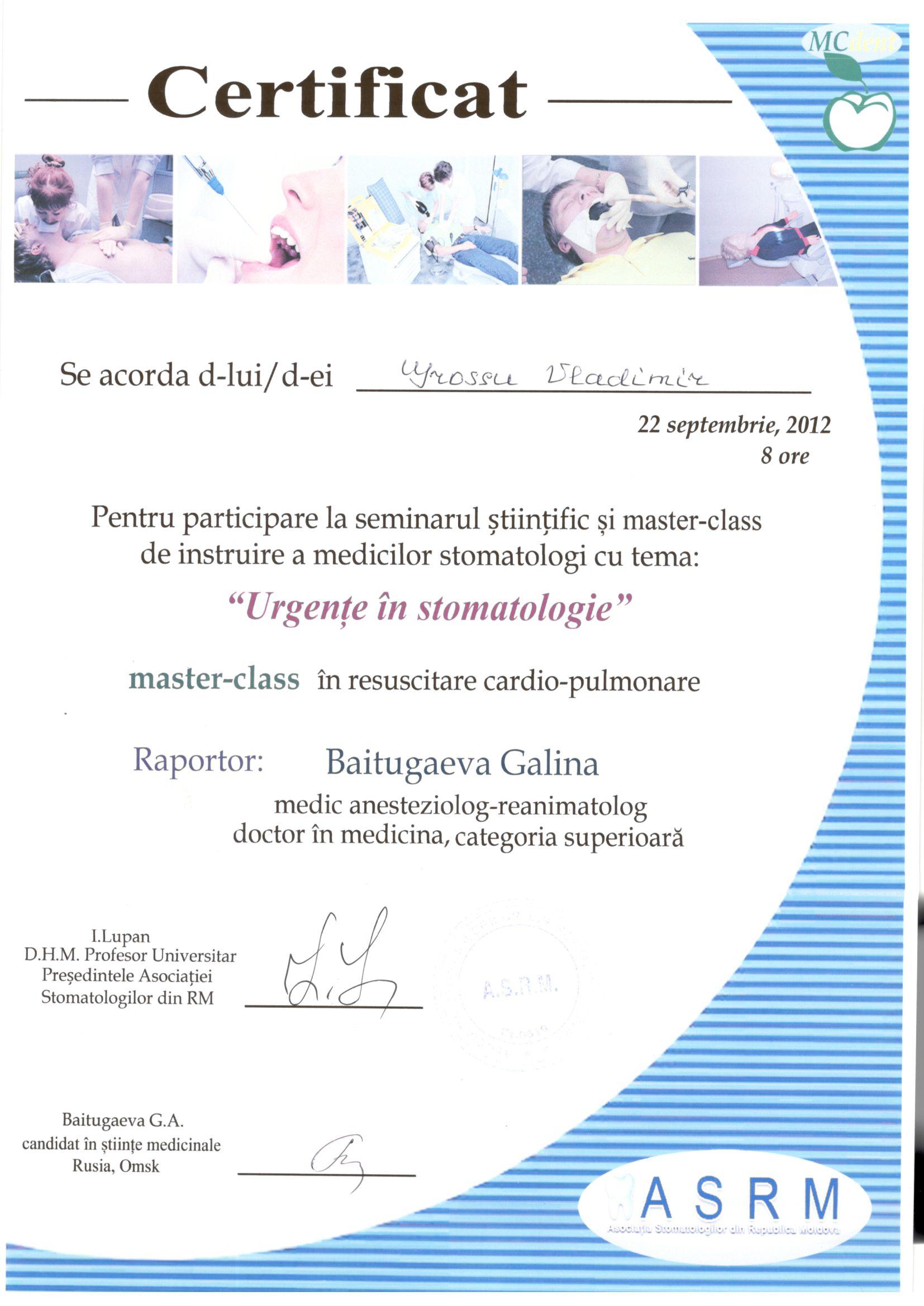 - 2012 – Urgențe în stomatologie – master class în resuscitarea cardiacă-pulmonară – (8 ore)