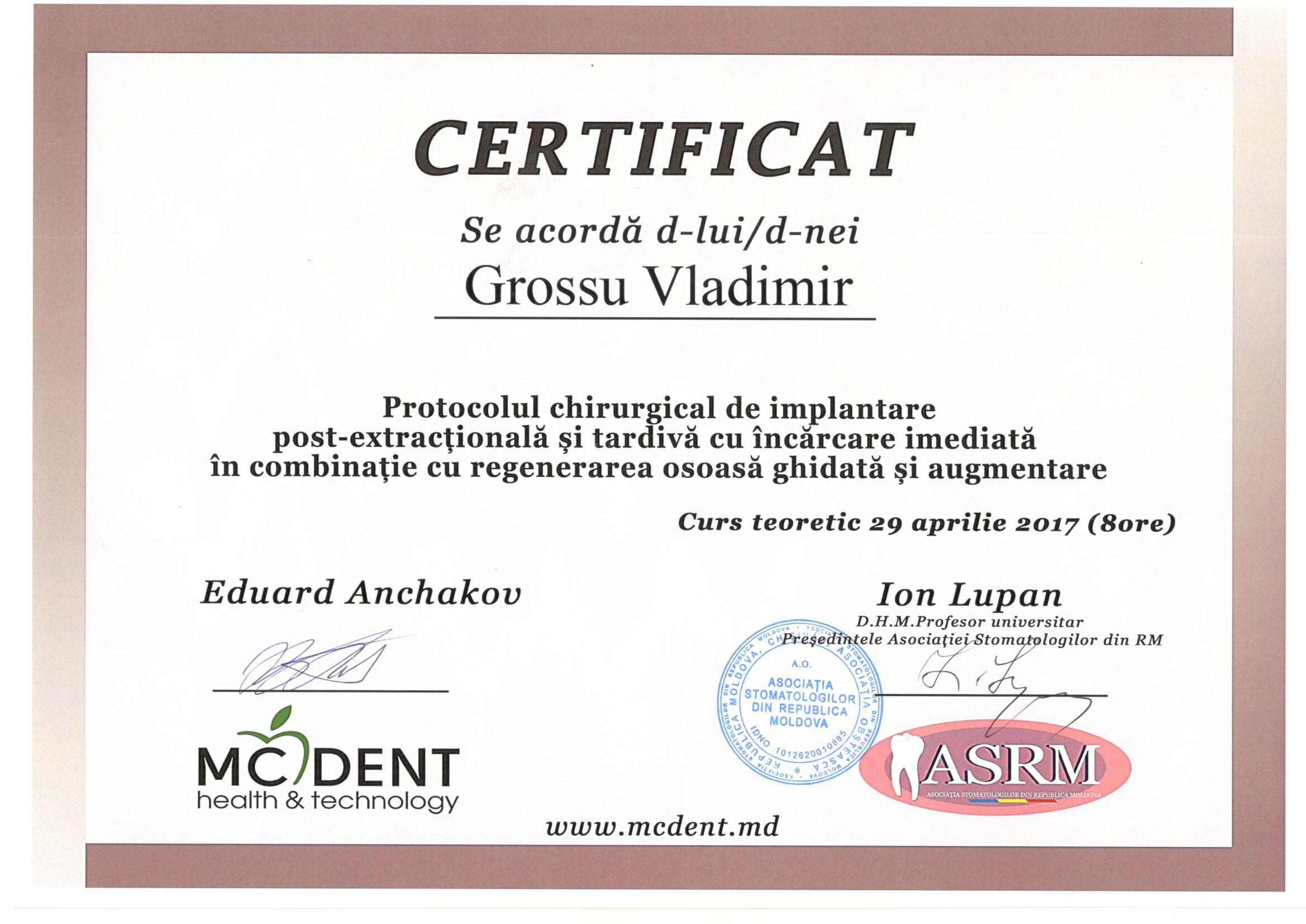 - 2017 – Protocolul chirurgical de implantare post- extracțională și tardivă cu încărcare imediată în combinație cu regenerarea osoasă ghidată și augmentare.