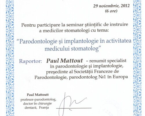 - 2012 – Parodontologie și implantologie în activitatea medicului stomatolog – (6 ore)
