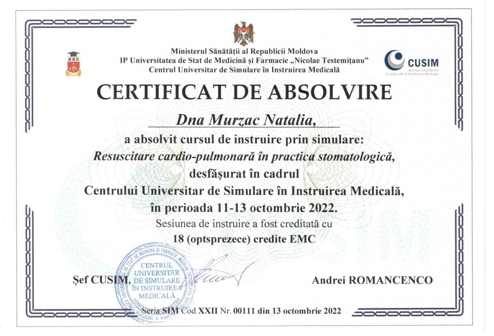 - 2022 – Resuscitare cardio-pilmonară în practica stomatologică, desfășurat în cadrul Centrului Universitar de Simulare în Instruirea Medicală