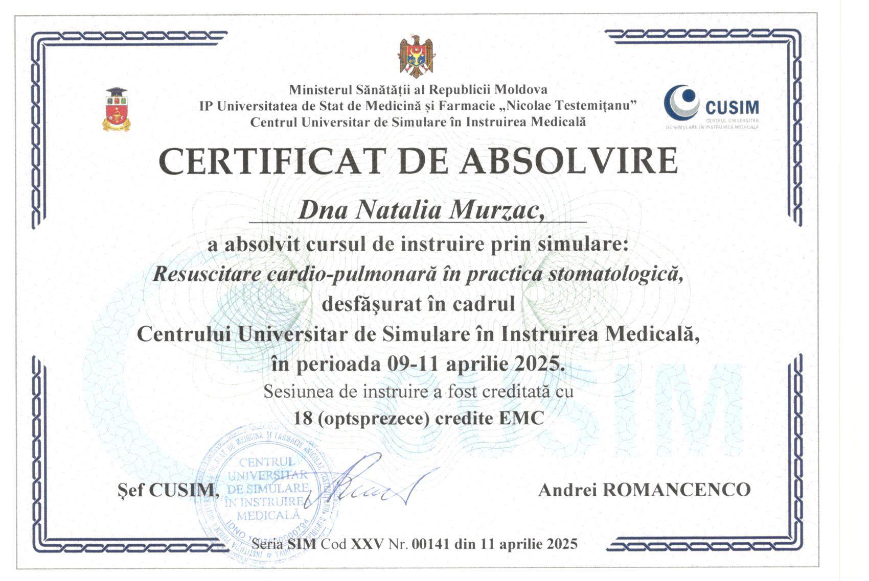 - 2025 – Resuacitare cardio-pilmonară în practica stomatologică, desfășurat în cadrul Centrului Universitar de Simulare în Instruirea Medicală