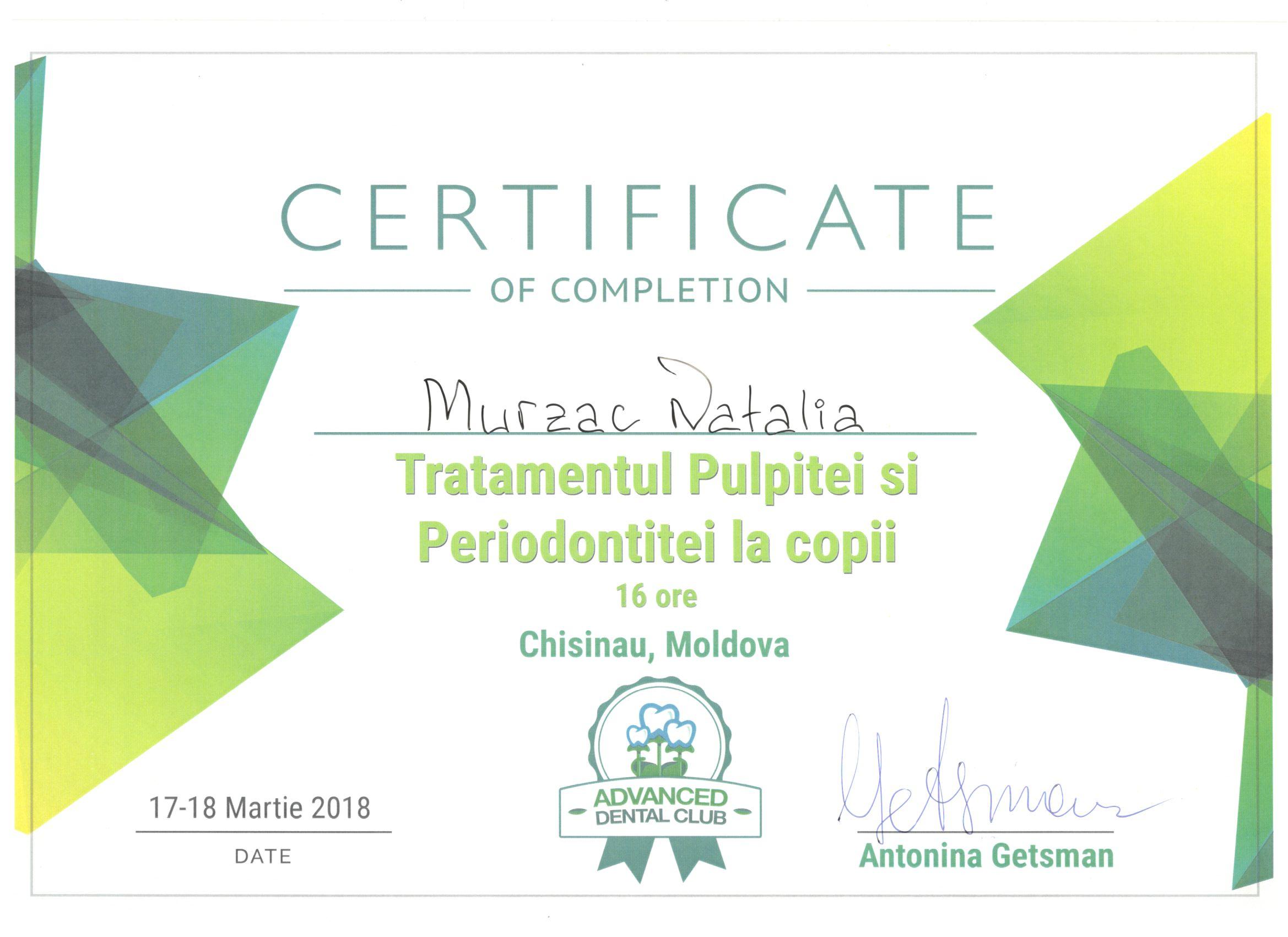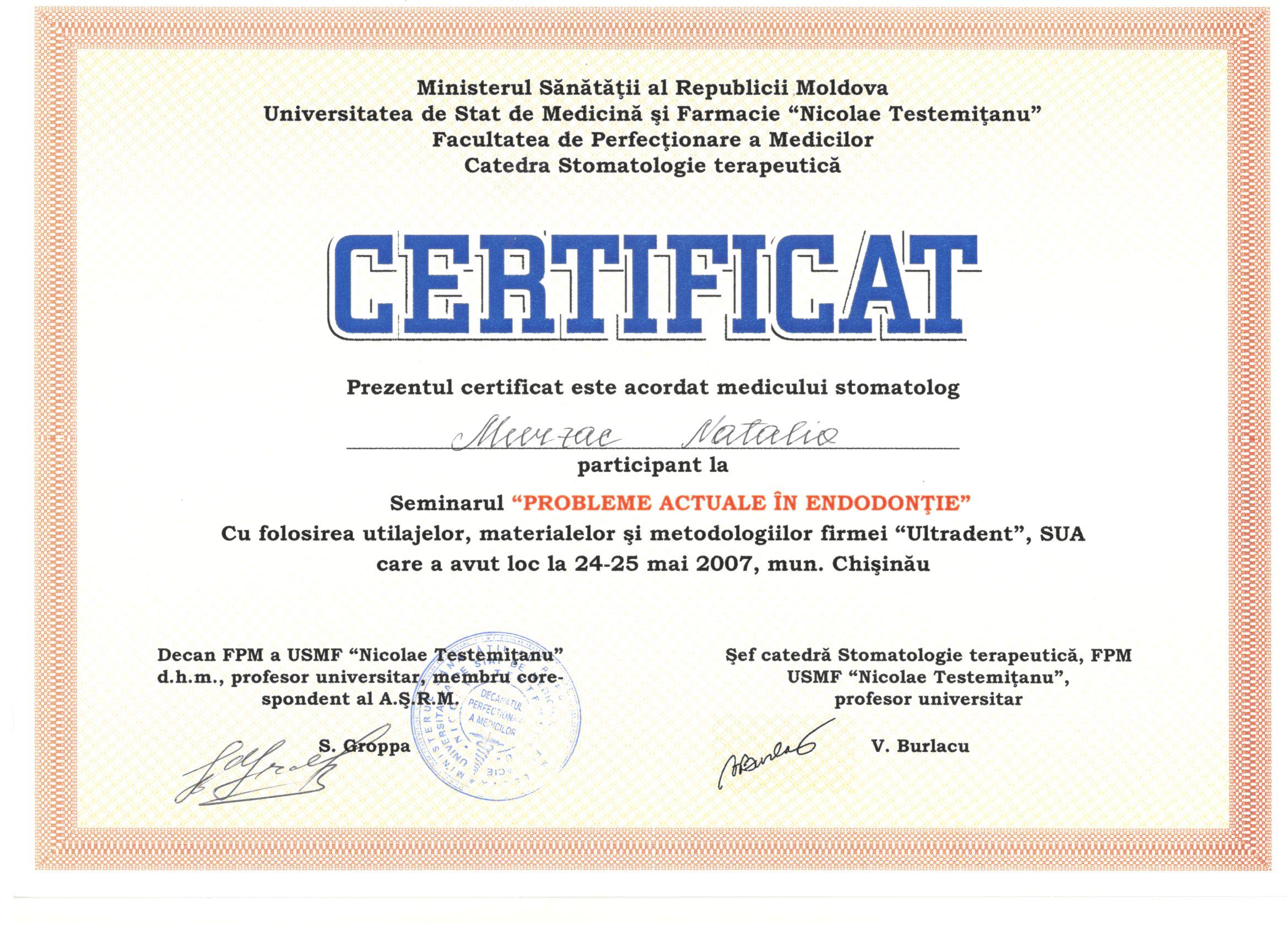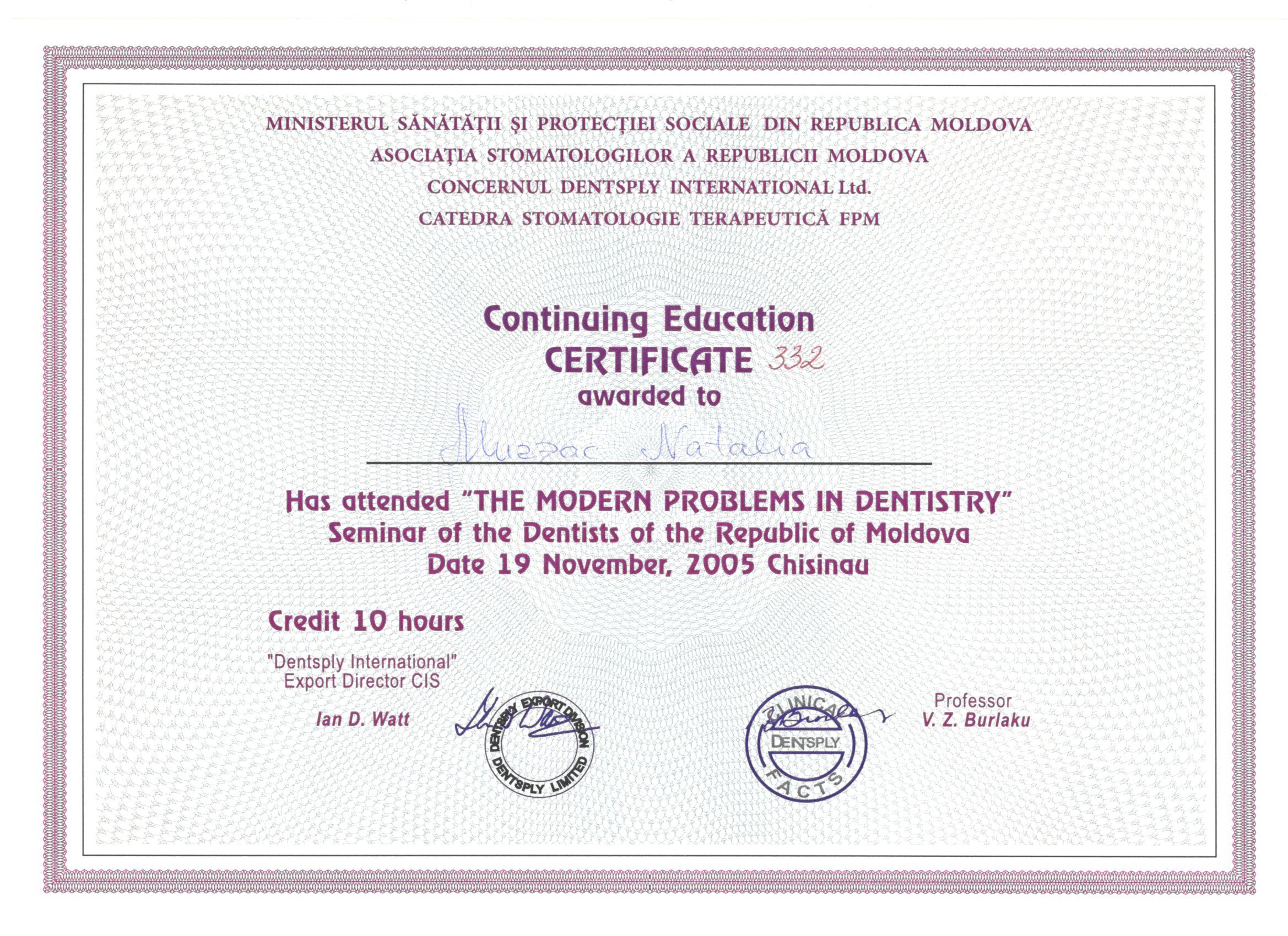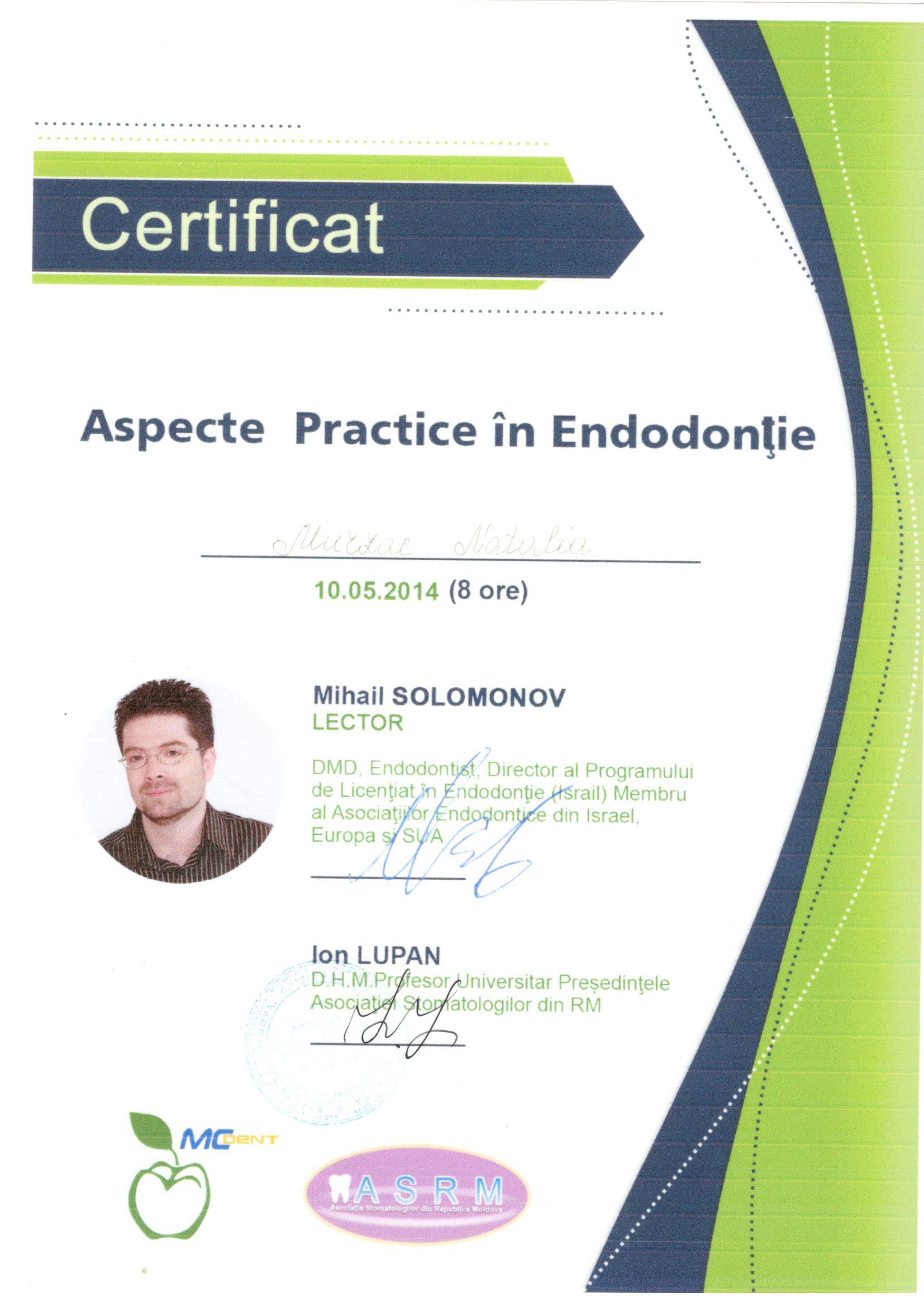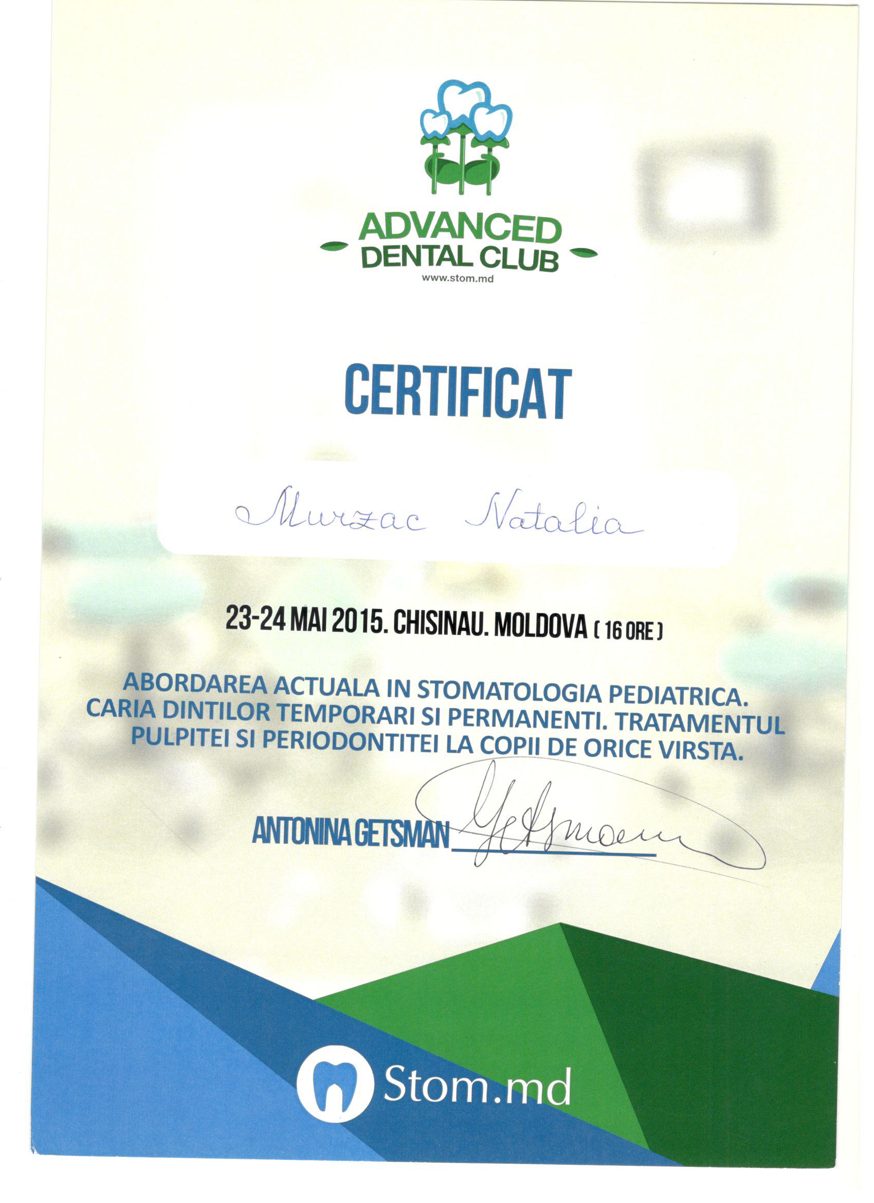 - 2015 – Abordarea actuală în stomatologia pediatrică. Caria dinților temporari si permanenti . Tratamentul păulpitei și periodontitei la copii de orice vărstă – (16 ore)