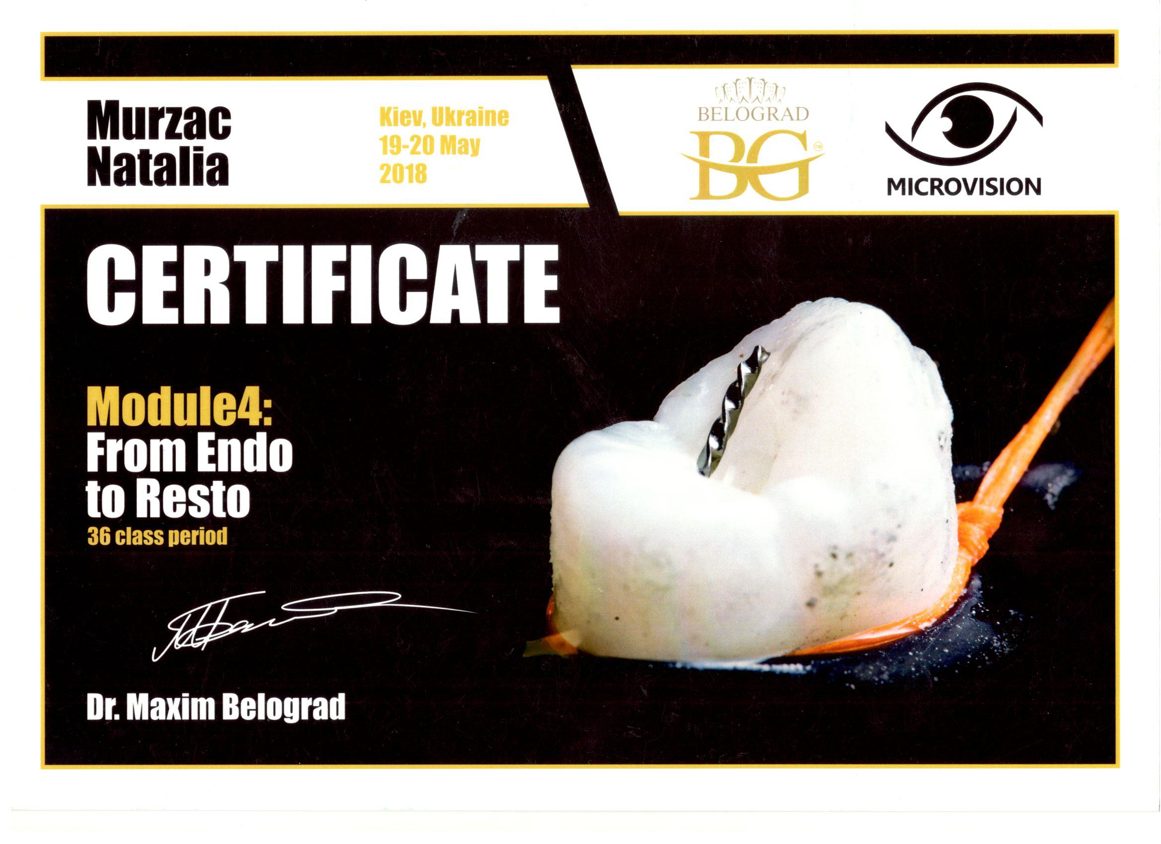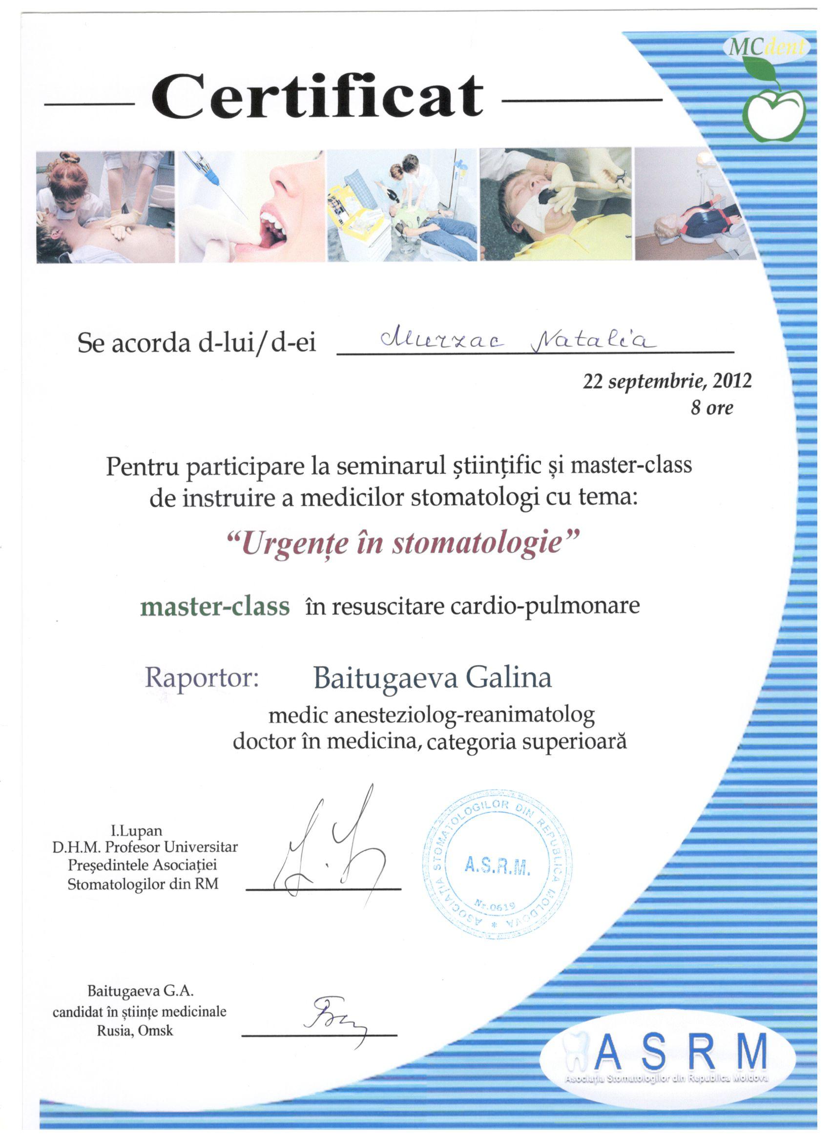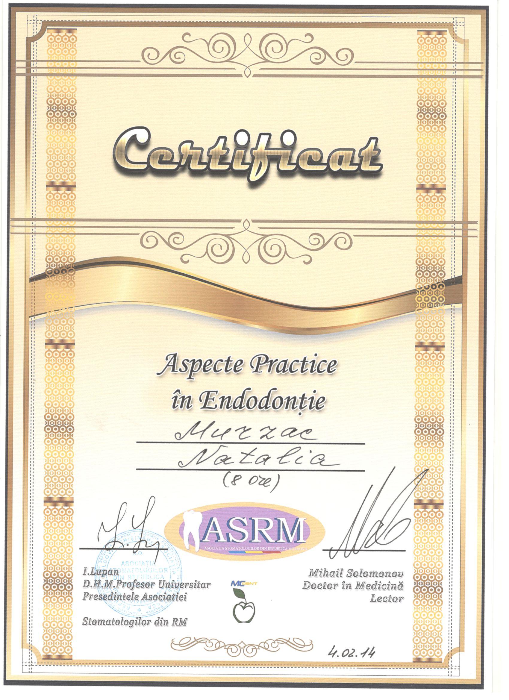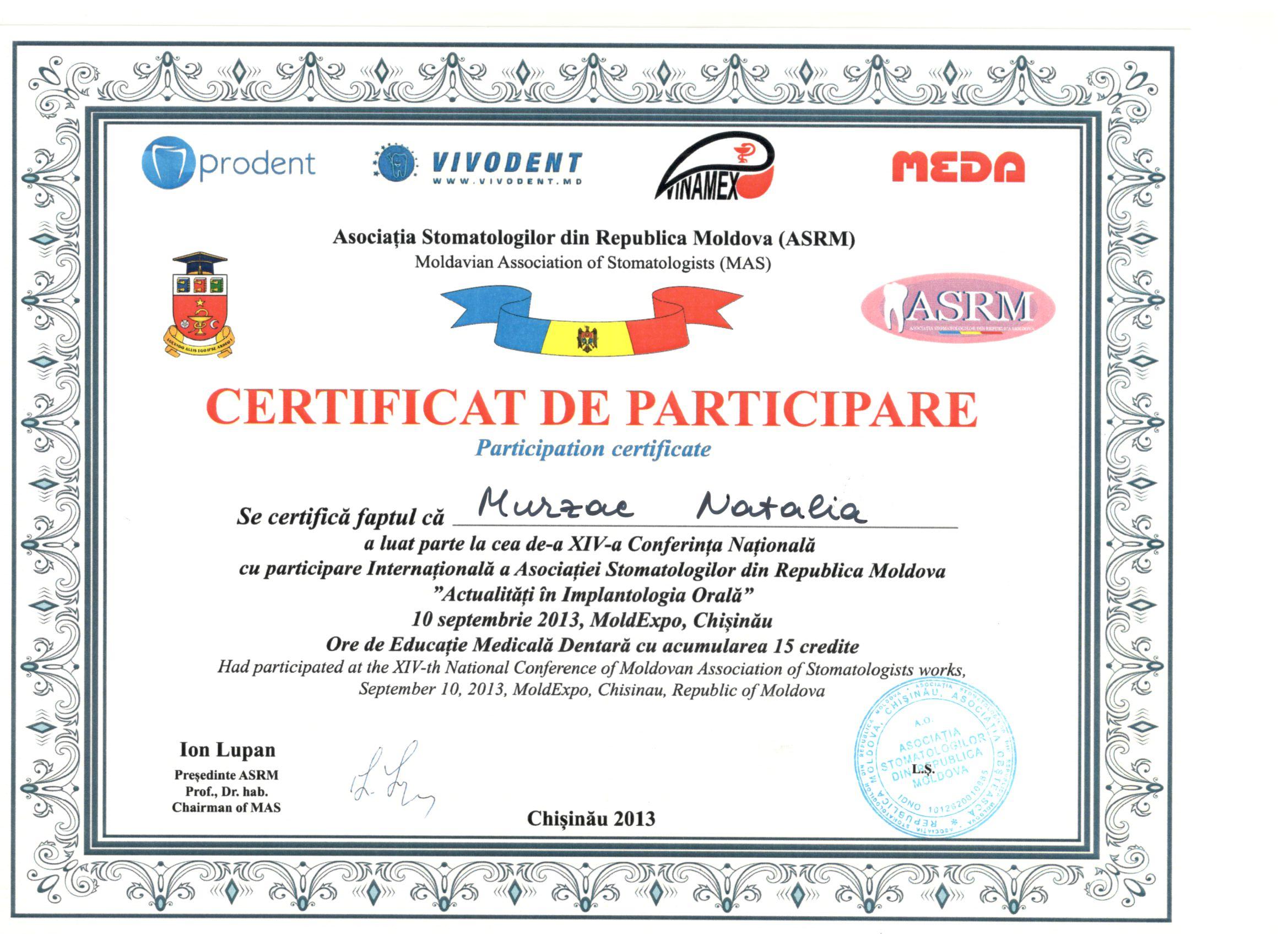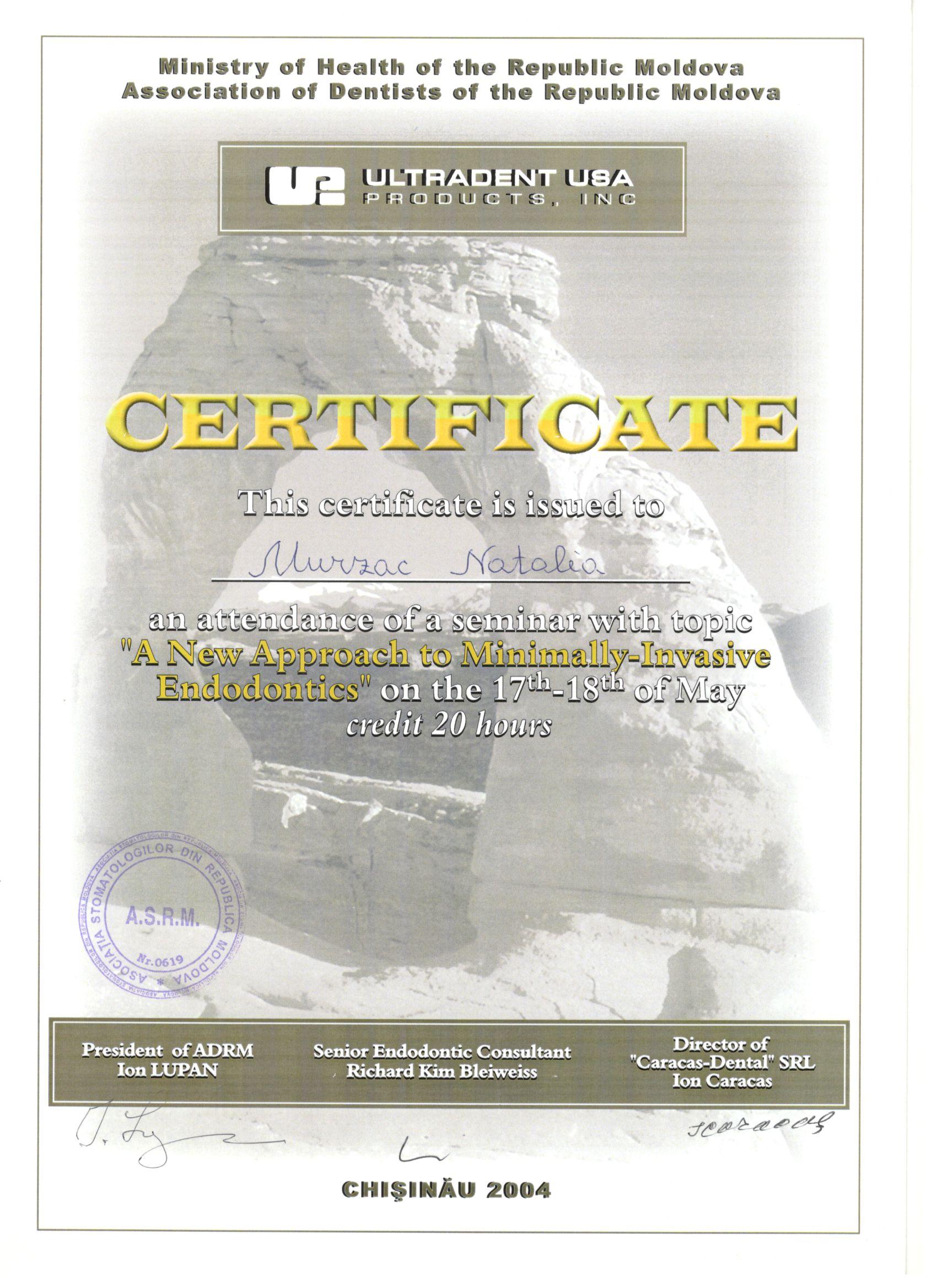 - 2015 – Abordarea actuală în stomatologia pediatrică. Caria dinților temporari si permanenti . Tratamentul păulpitei și periodontitei la copii de orice vărstă – (16 ore)
