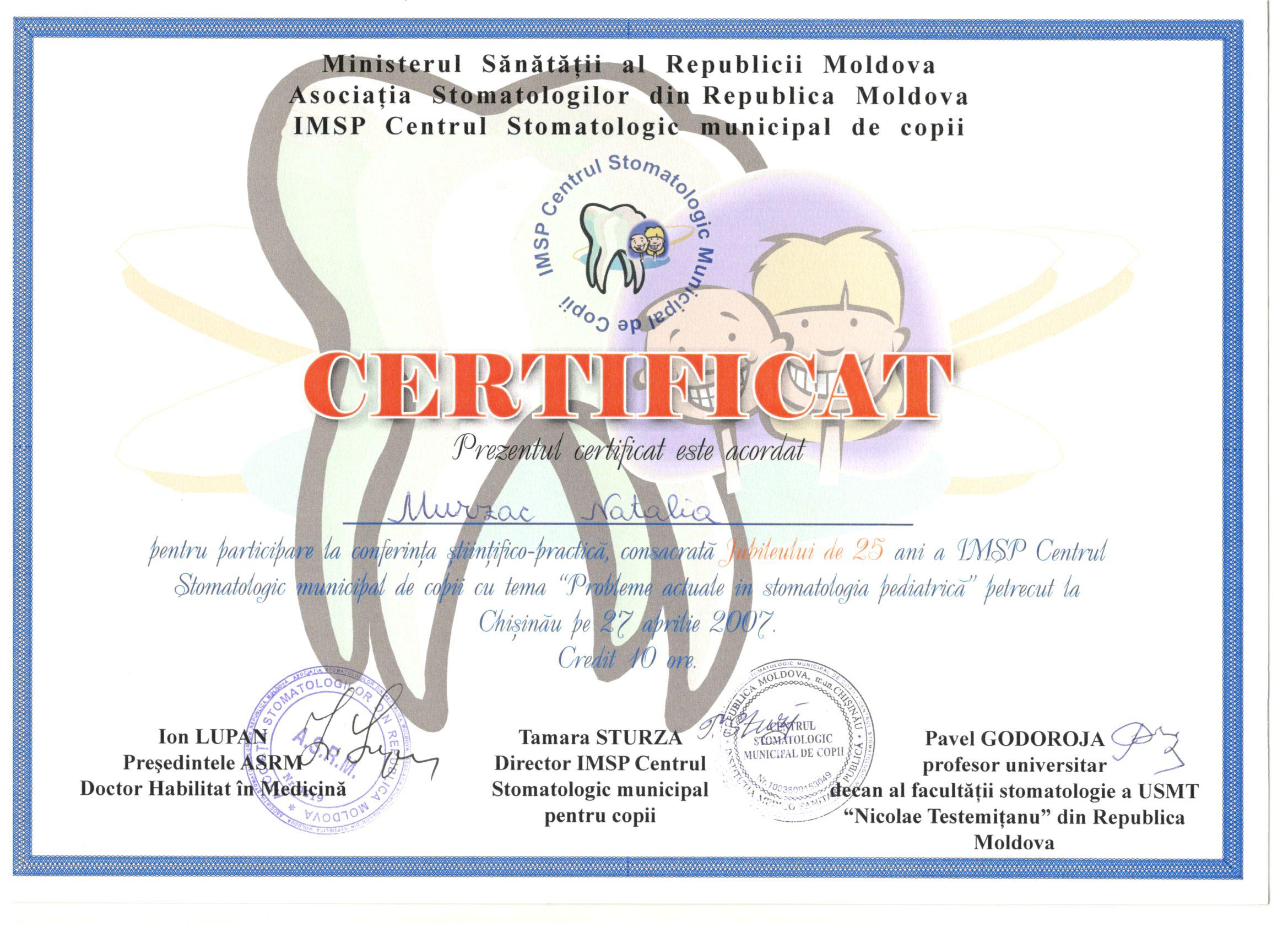 - 2007 – Probleme actuale în stomatologia pediatrică – (10 ore)
