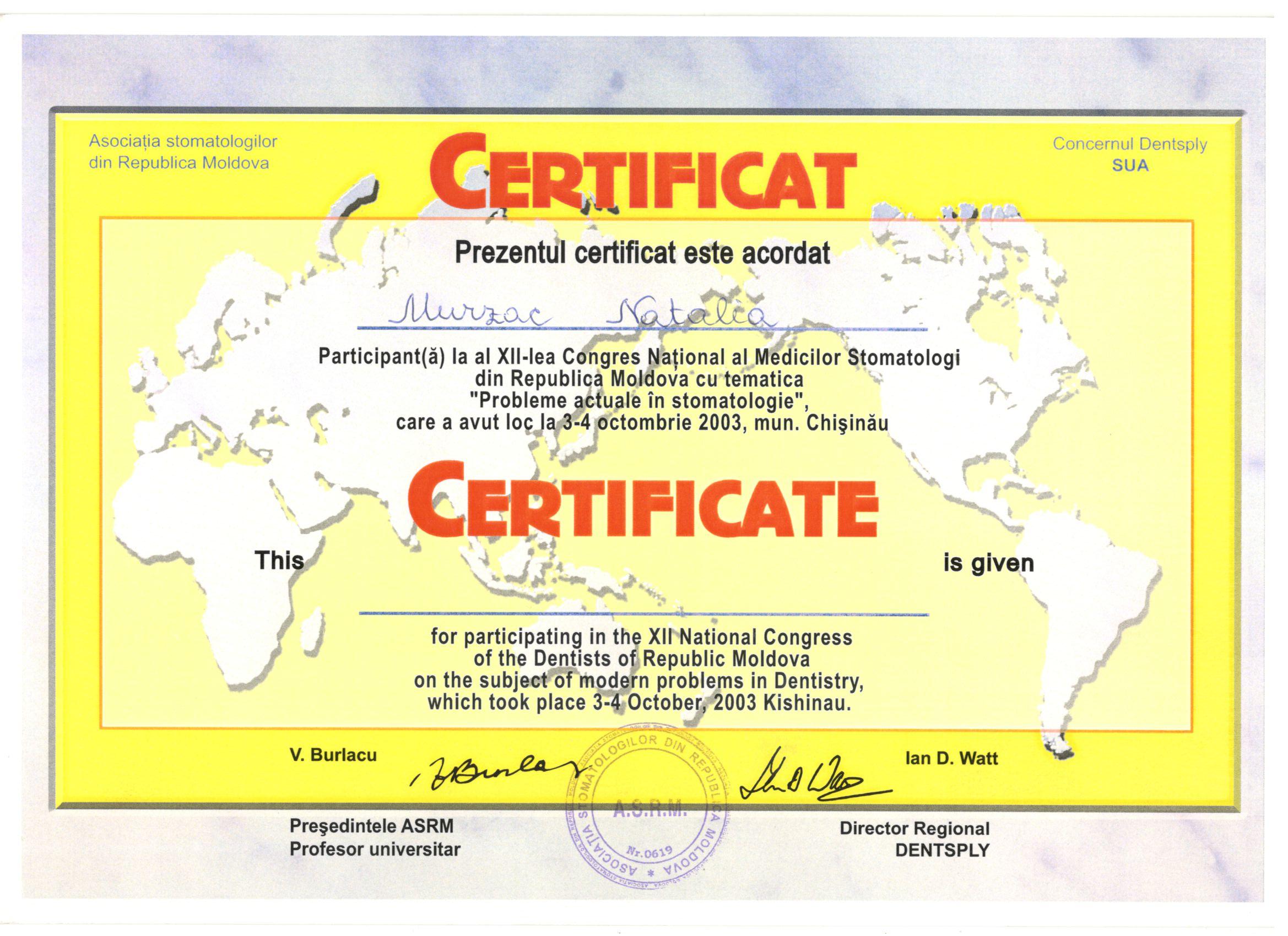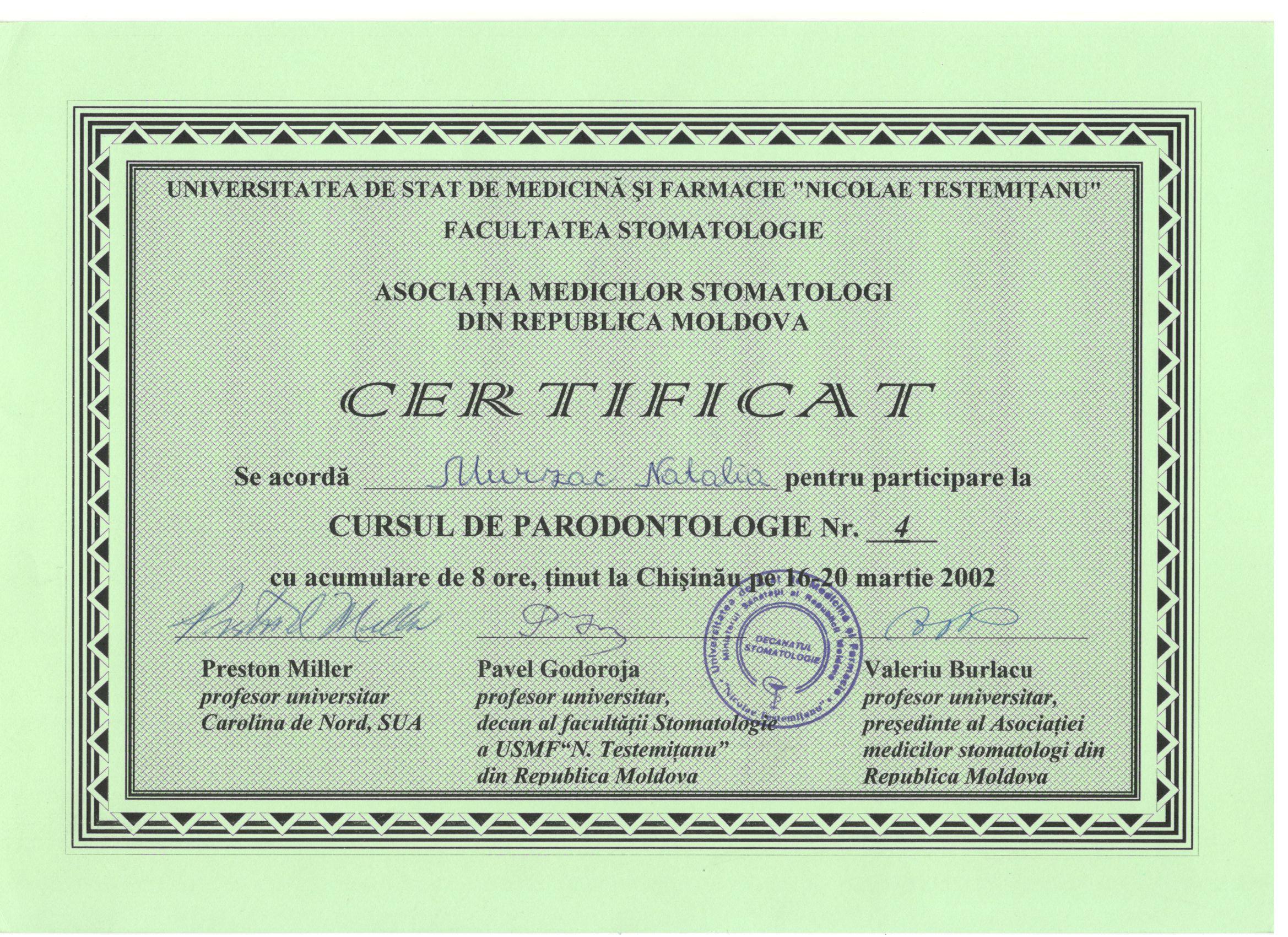 - Studii postuniversitare prin rezidențiat la specialitatea – Medic stomatolog la Univesitatea de Medicină și Farmacie „Nicolae 2000-2003