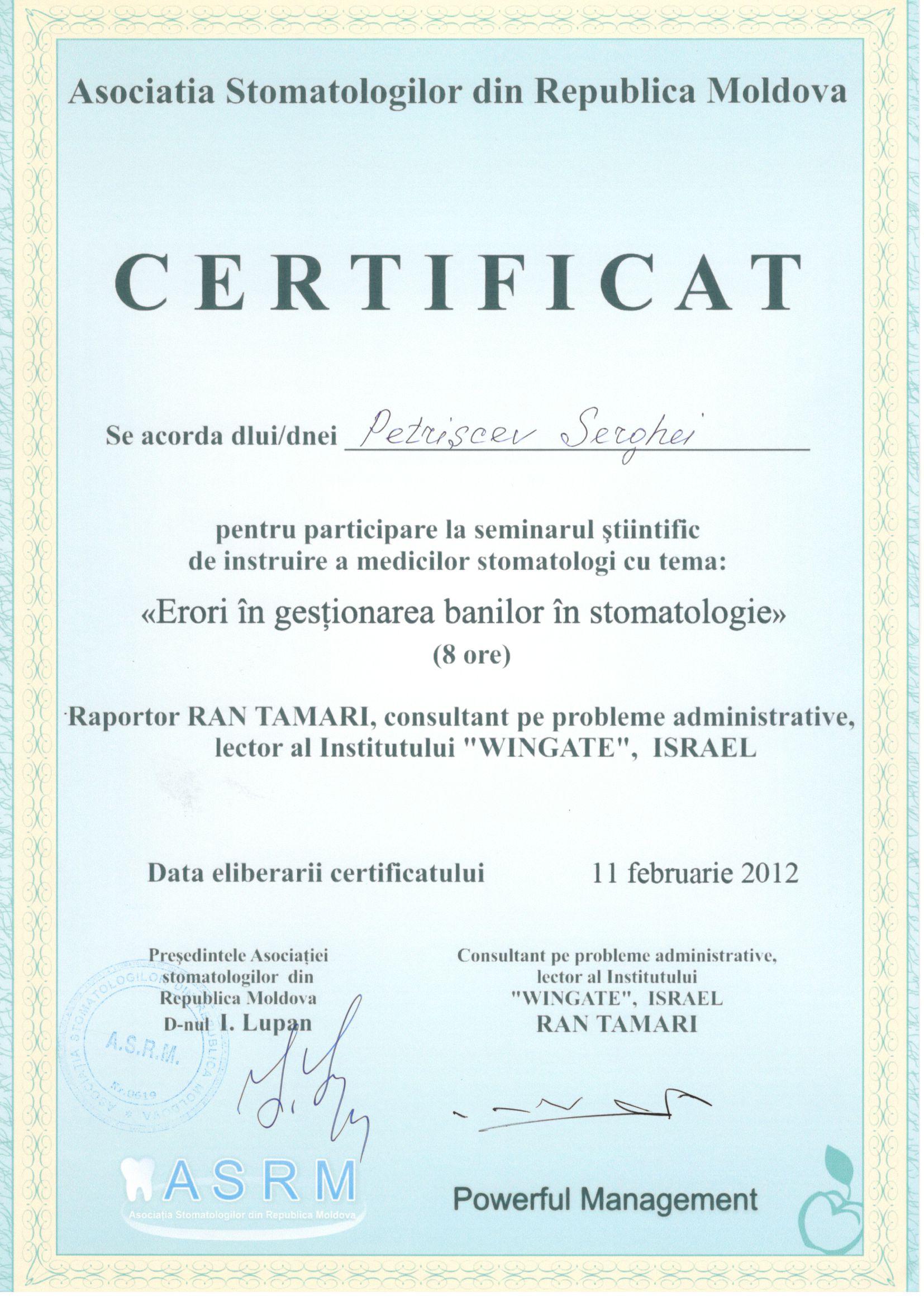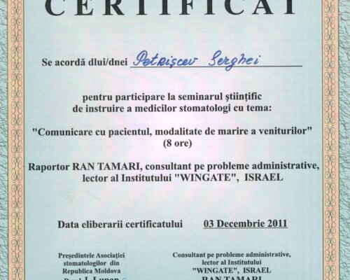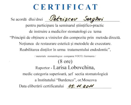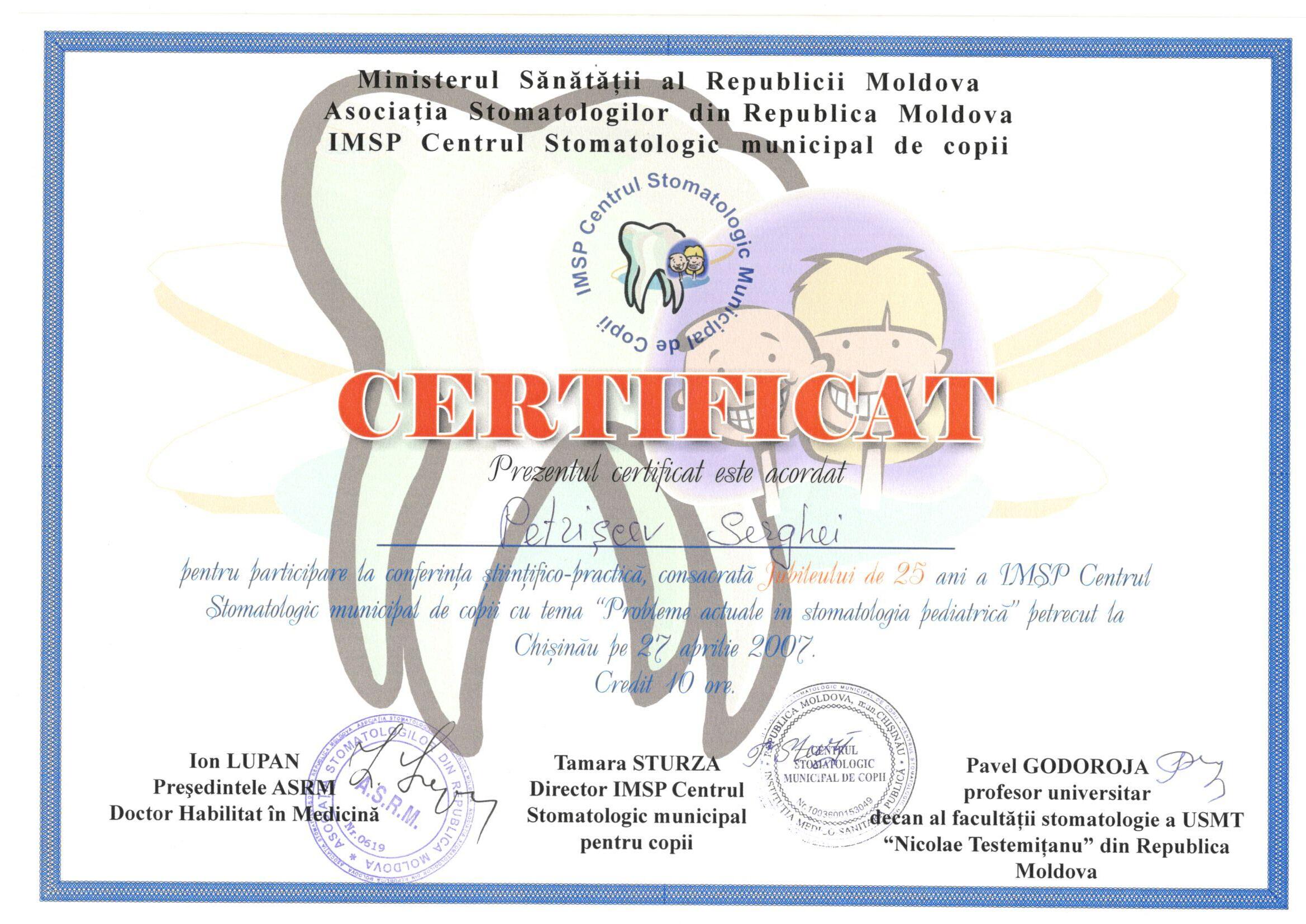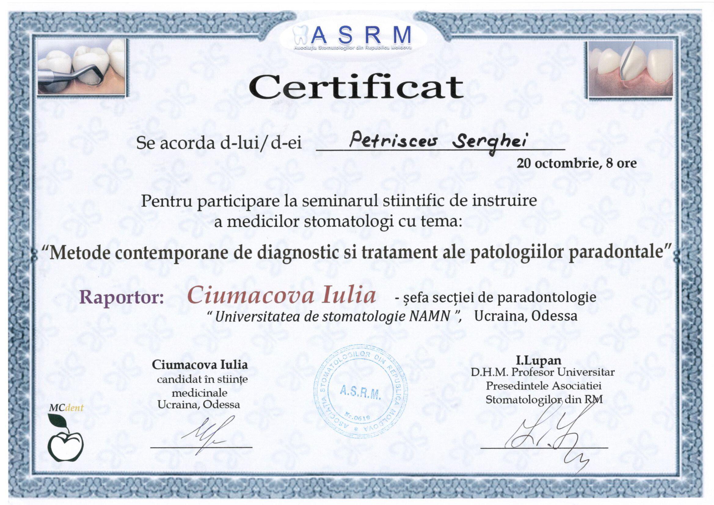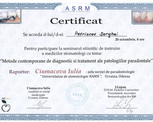 - Studii postuniversitare prin rezidențiat la specialitatea – Medic stomatolog la Univesitatea de Medicină și Farmacie „Nicolae 2000-2003