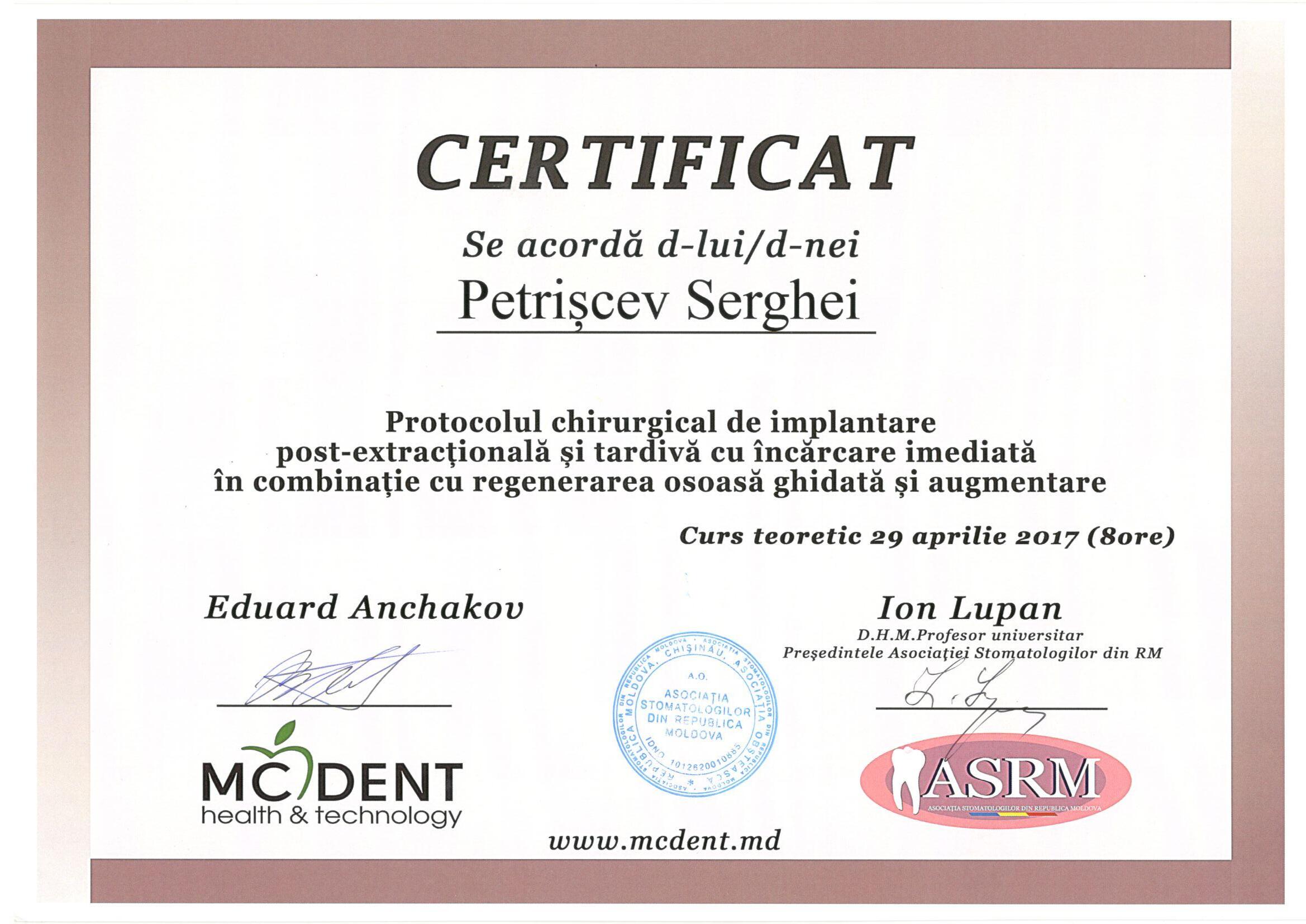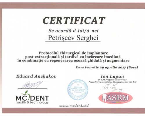 - 2017 – Protocolul chirurgical de implantare post-extracțională și tardivă cu încărcare imediată în combinație cu regenerarea osoasă ghidată și augmentare