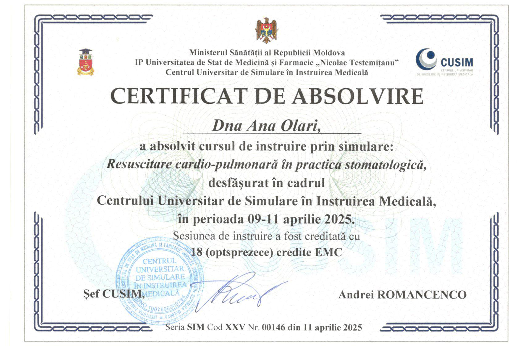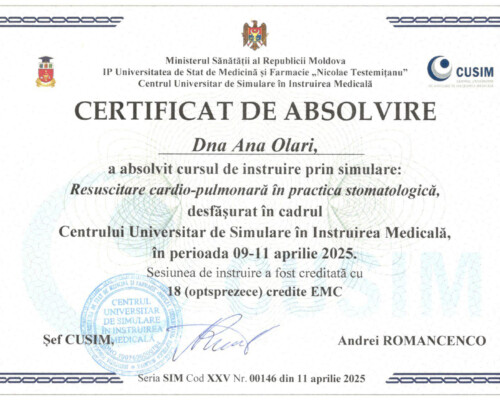 - 2025 – curs de instruire prin simulare: Resuscitare cardio- pulmonară în practica stomatologică. CUSIM