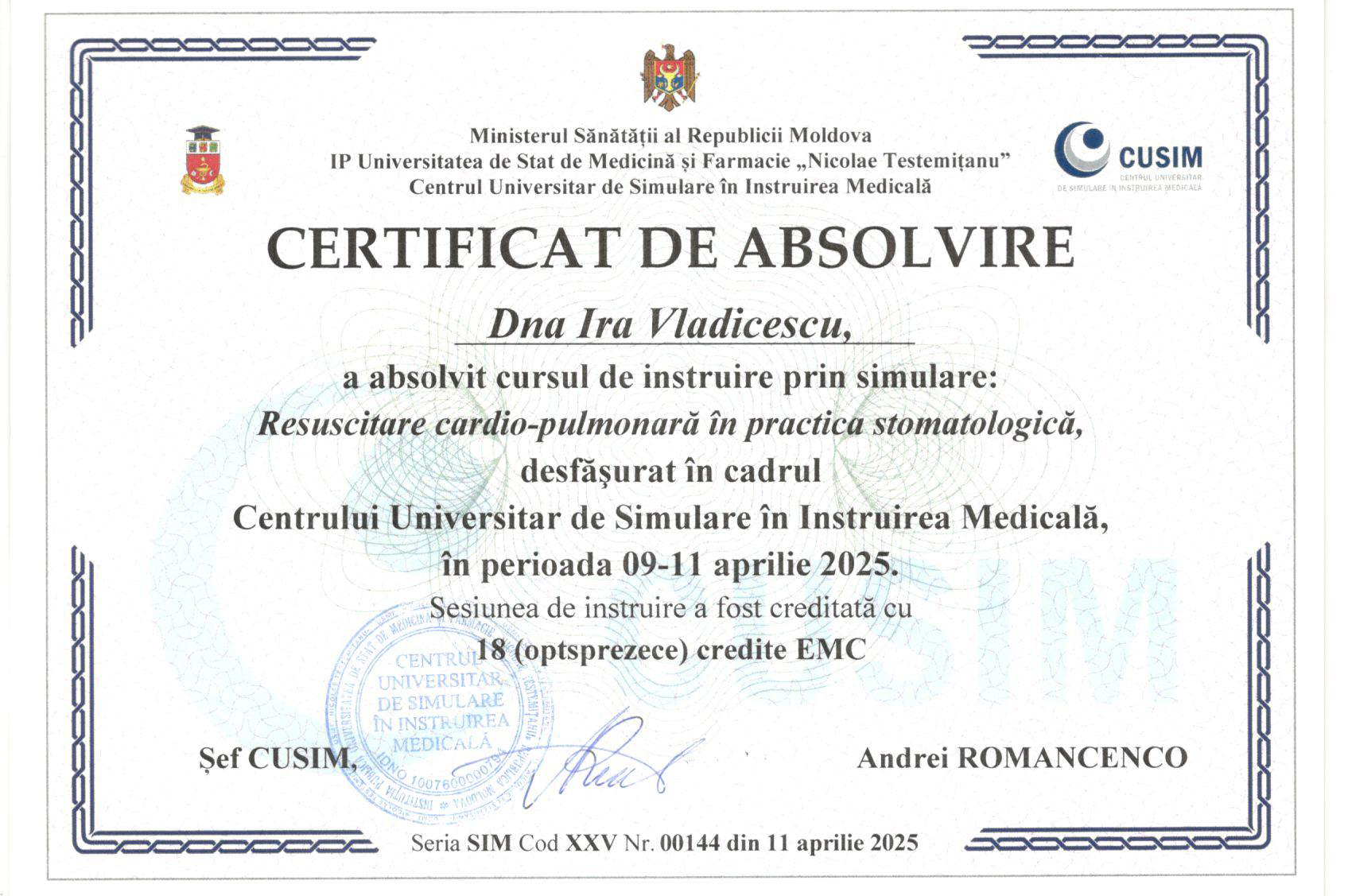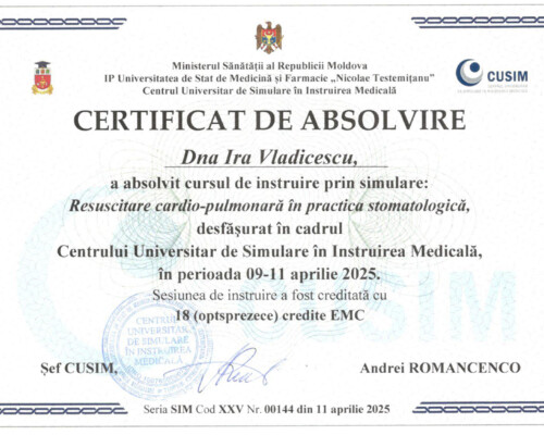 - 2025 – curs de instruire prin simulare: Resuscitare cardio- pulmonară în practica stomatologică. CUSIM